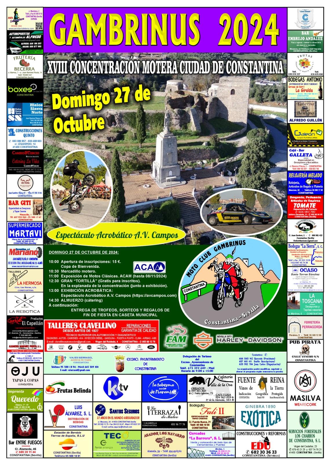 El Excelentísimo Ayuntamiento de Constantina colabora con el Motoclub Gambrinus Constantina en la organización de la XVIII Concentración Motera "Gambrinus 2024" que tendrá lugar el próximo domingo 27 de octubre en la Caseta Municipal de Constantina.