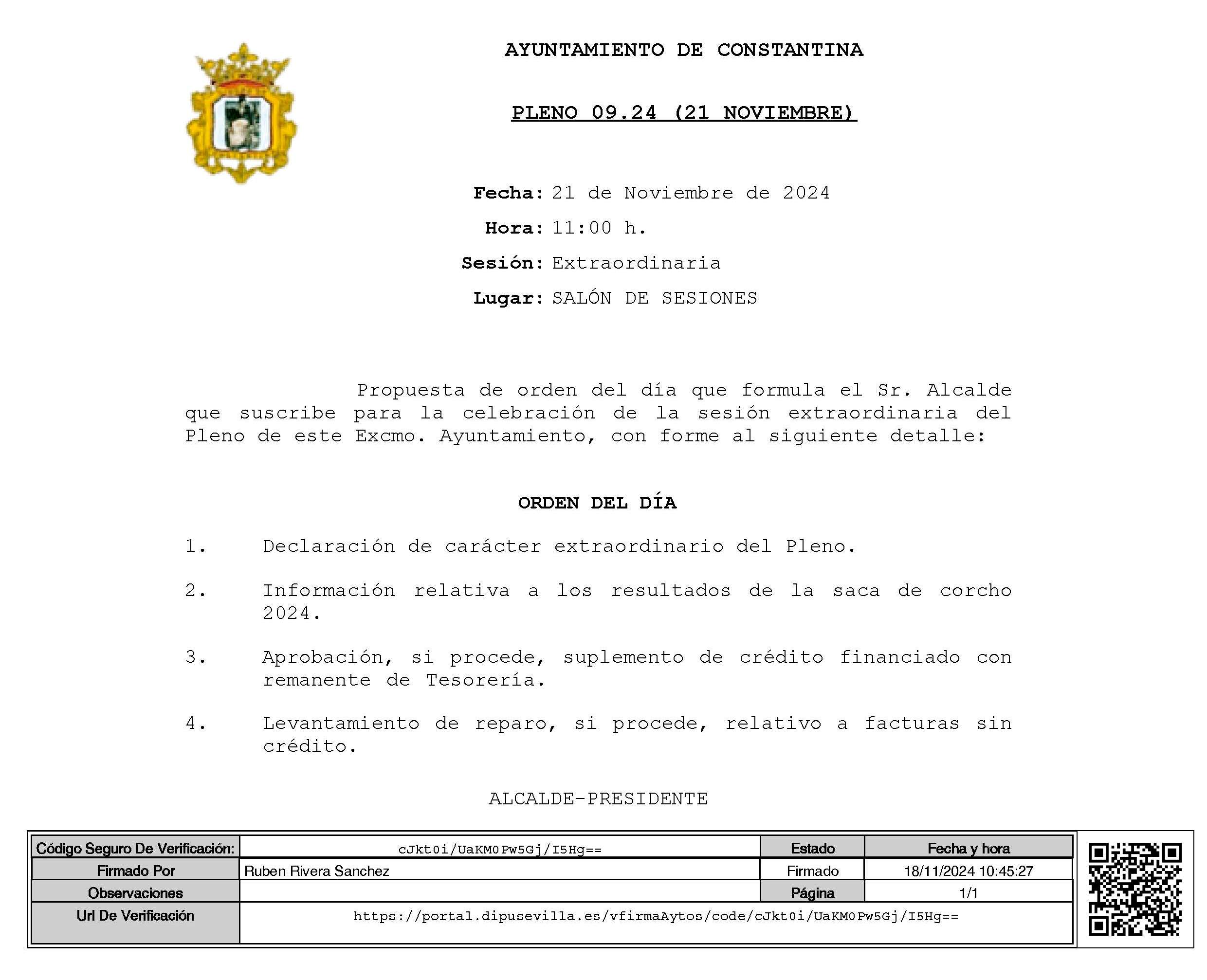 CONVOCATORIA DE SESIÓN EXTRAORDINARIA PLENO CONSTANTINA