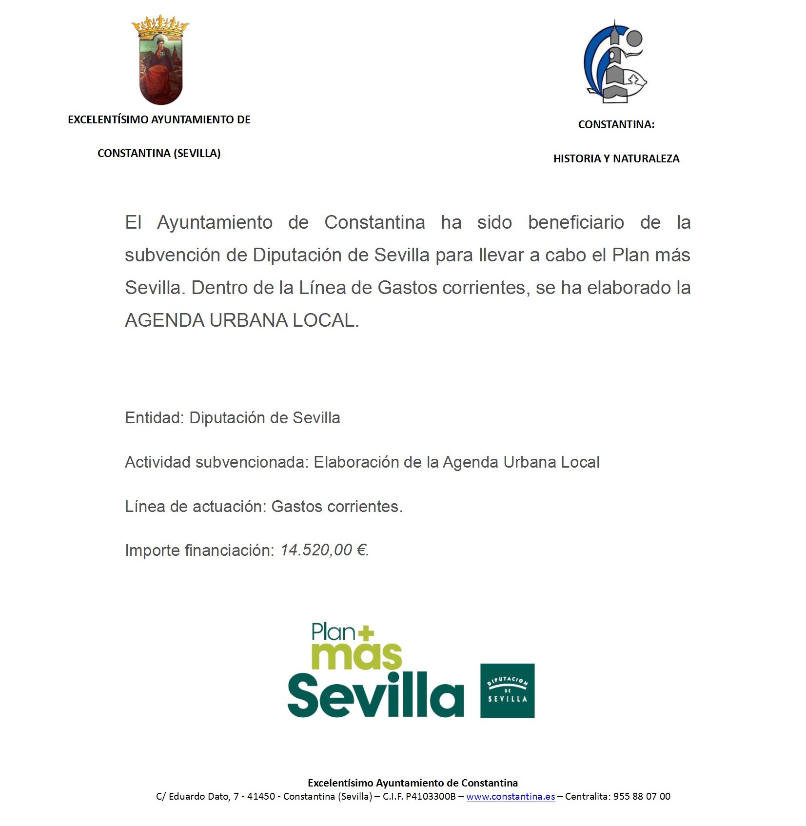 El Ayuntamiento de Constantina ha sido beneficiario de la subvención de Diputación de Sevilla para llevar a cabo el Plan Más Sevilla, se ha elaborado la AGENDA URBANA LOCAL.