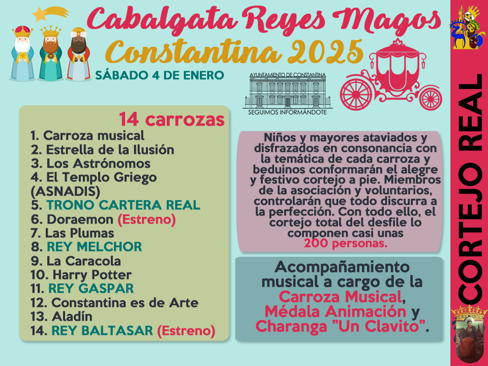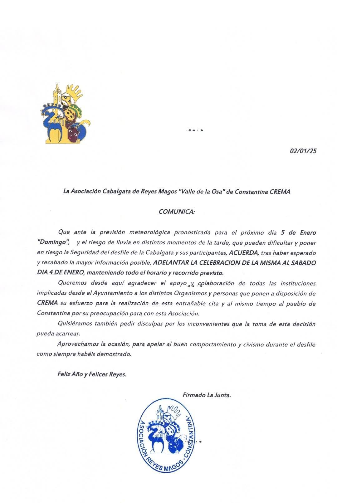 Nos hacemos eco de la decisión de Crema Constantina de adelantar la Cabalgata de Reyes Magos Constantina 2025 al sábado 4 de enero debido a los pronósticos de lluvia para el 5 de enero.