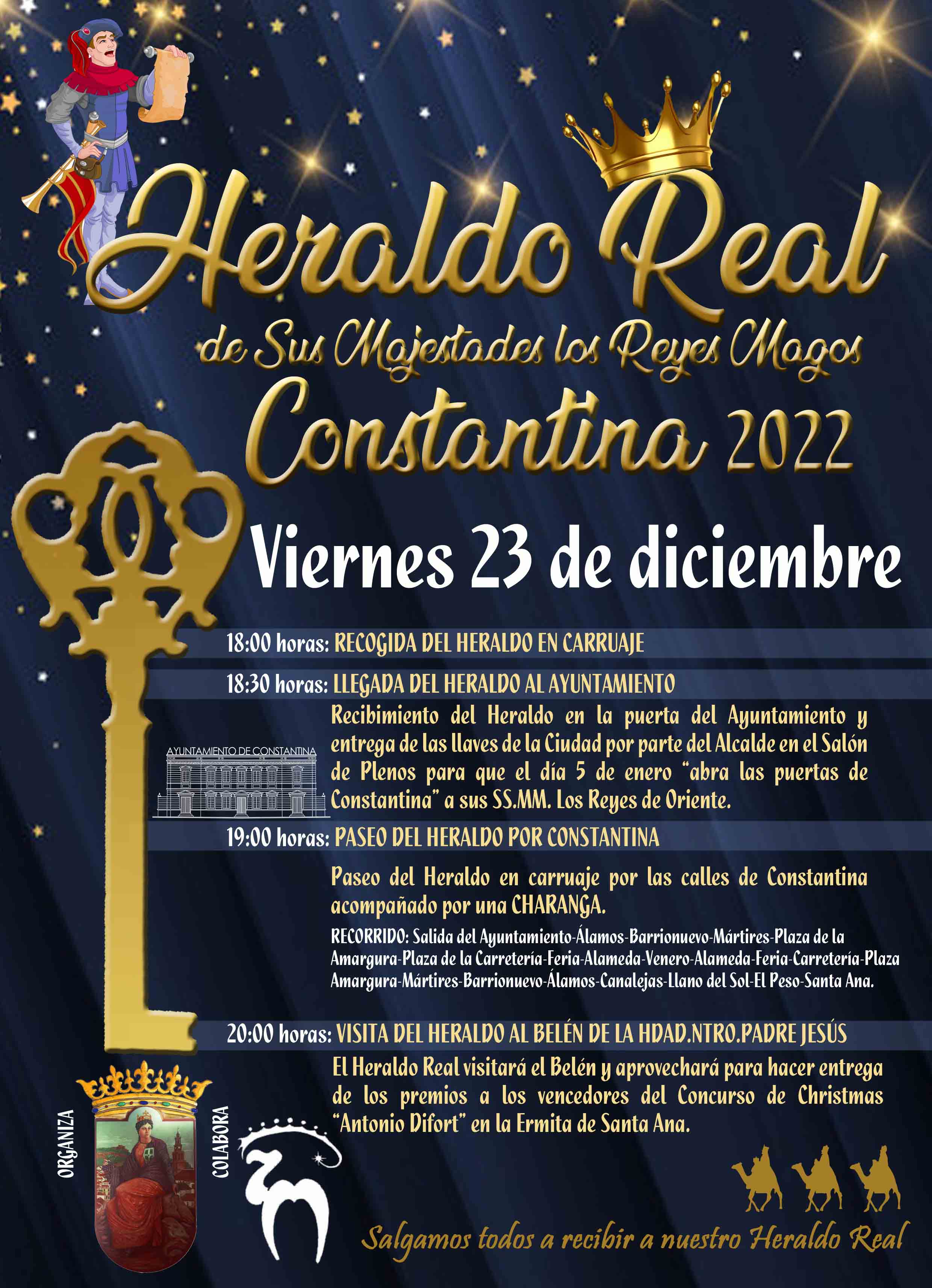 El próximo viernes 23 de diciembre, el Heraldo Real será recibido oficialmente por el Alcalde de Constantina en el Ayuntamiento para hacerle entrega de las llaves de la Ciudad y que él se las haga llegar a Sus Majestades los Reyes de Oriente el día 5 de enero para que puedan "abrir" todos los hogares de nuestra localidad y entregarnos regalos, sueños e ilusiones.