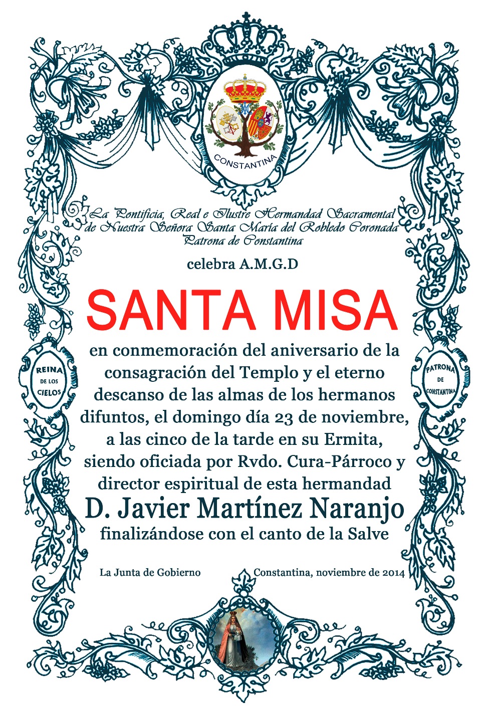 La Pontificia, Real e Ilustre Hermandad Sacramental de Nuestra Señora, Santa María del Robledo Coronada, Patrona de Constantina celebra este domingo 23 de noviembre, a las cinco de la tarde, una Santa Misa en su Ermita. En conmemoración por el aniversario de la consagración del Templo y el eterno descanso de las almas de los hermanos difuntos, será oficiada por el Cura-Párroco el Rvdo. Javier Martínez Naranjo y finalizará con el canto de la Salve.