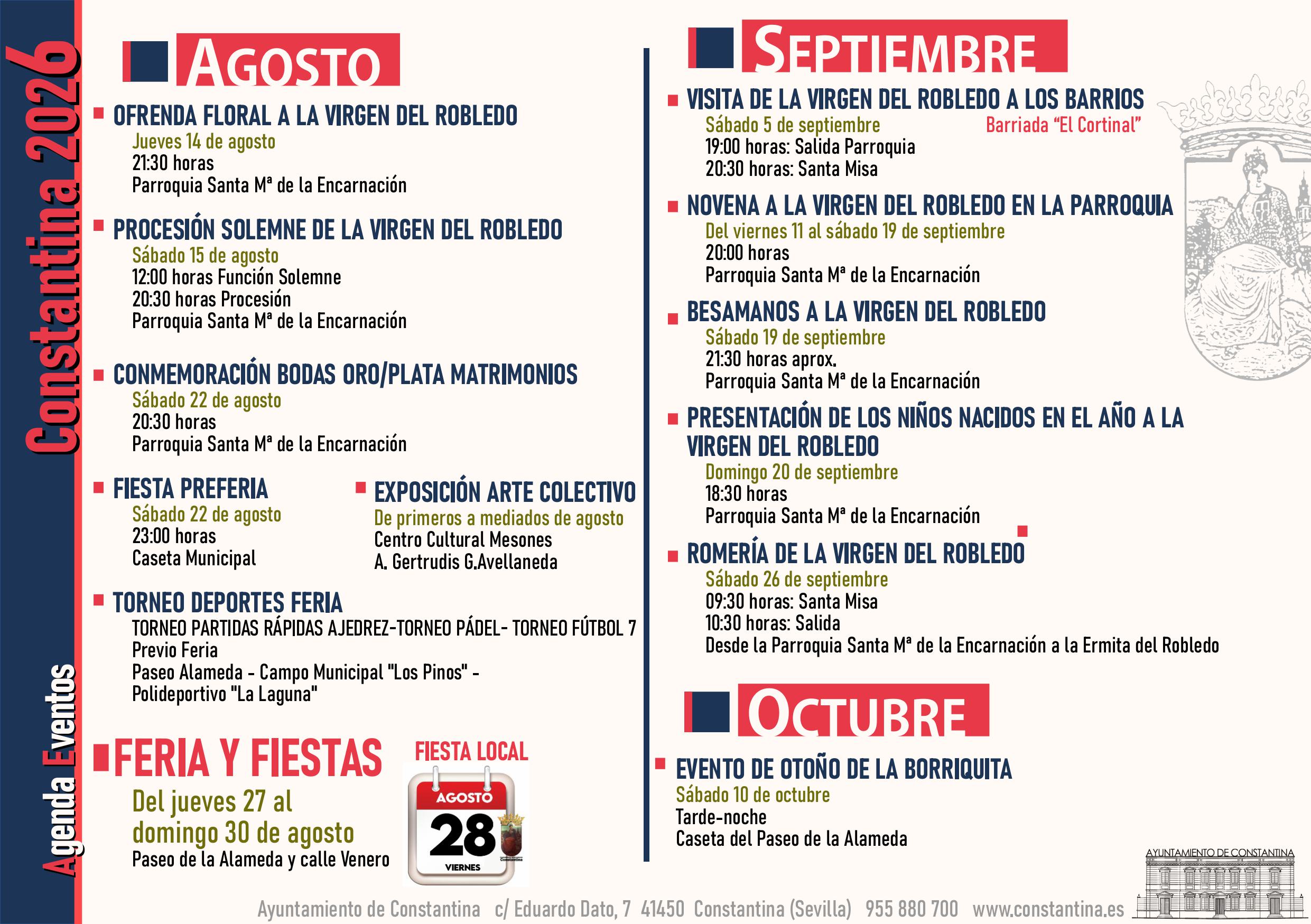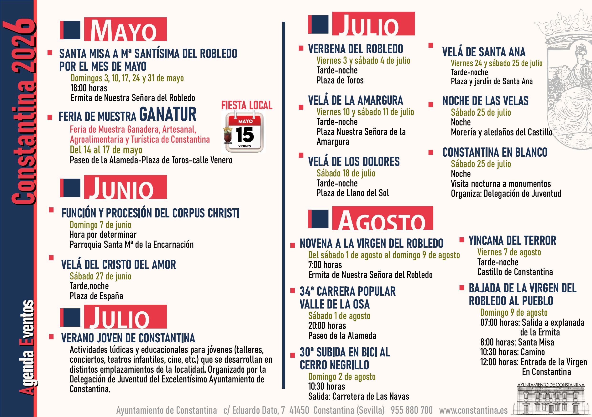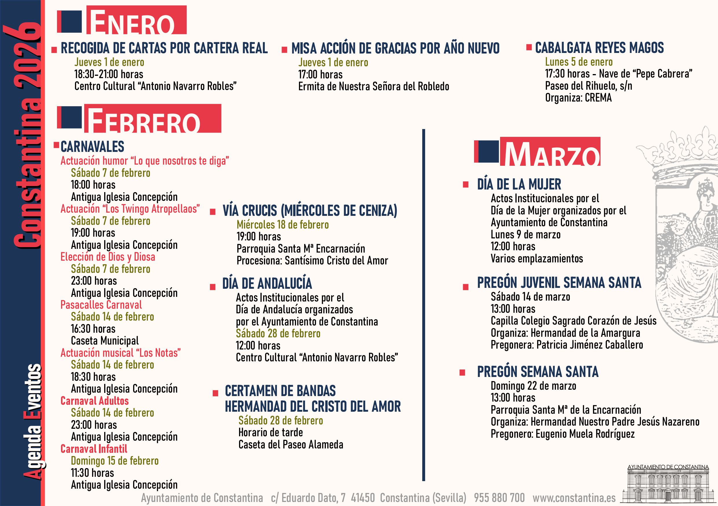 Os presentamos la Agenda de Eventos, editada por el Gabinete de Prensa del Ayuntamiento de Constantina , que incluye los acontecimientos, las fiestas y las actividades que se celebrarán en nuestro municipio a lo largo del año 2026, unos organizados desde nuestro Ayuntamiento y otros en colaboración con numerosos agentes sociales e instituciones de la localidad, todos ellos con nuestro máximo apoyo y ayuda posibles.