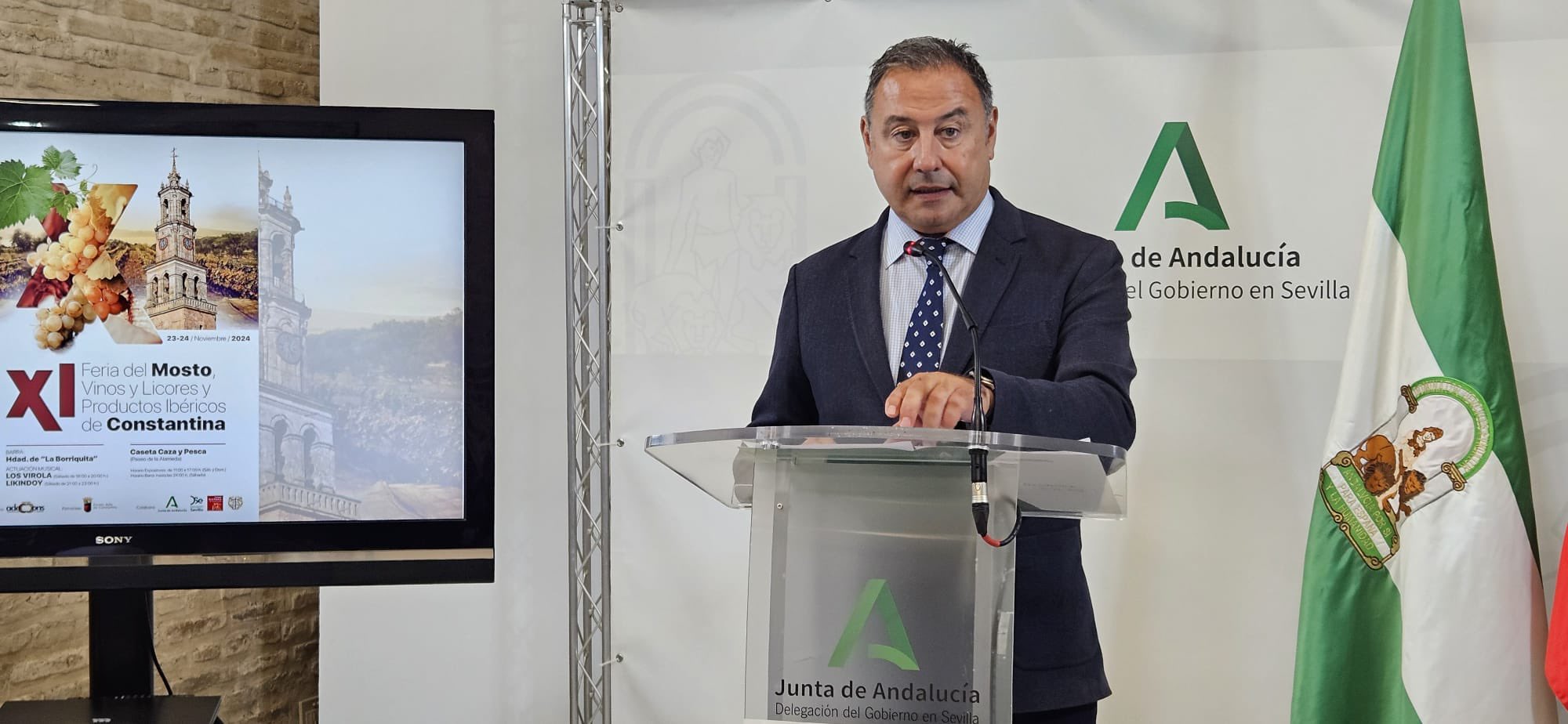 El delegado del Gobierno de la Junta de Andalucía en Sevilla, Ricardo Sánchez, junto al alcalde de Constantina, Rubén Rivera, presentaba el pasado viernes 15 de noviembre la XI Feria del Mosto, Vino, Licores y Productos Ibéricos de Constantina, que se celebrará en la localidad serrana los próximos sábado 23 y domingo 24 de noviembre. La muestra, organizada por la Asociación de Empresarios y Comerciantes de Constantina (Adeccons) en colaboración con el Ayuntamiento de la localidad, la Junta de Andalucía, Turismo de la Provincia de Sevilla y la Diputación de Sevilla, se desarrollará en la Caseta de Caza y Pesca, en pleno Paseo de la Alameda en donde, además de mosto, las bodegas del municipio ofrecerán vinos y licores de las destilerías de la localidad, aceitunas, dulces y chacinas ibéricas.