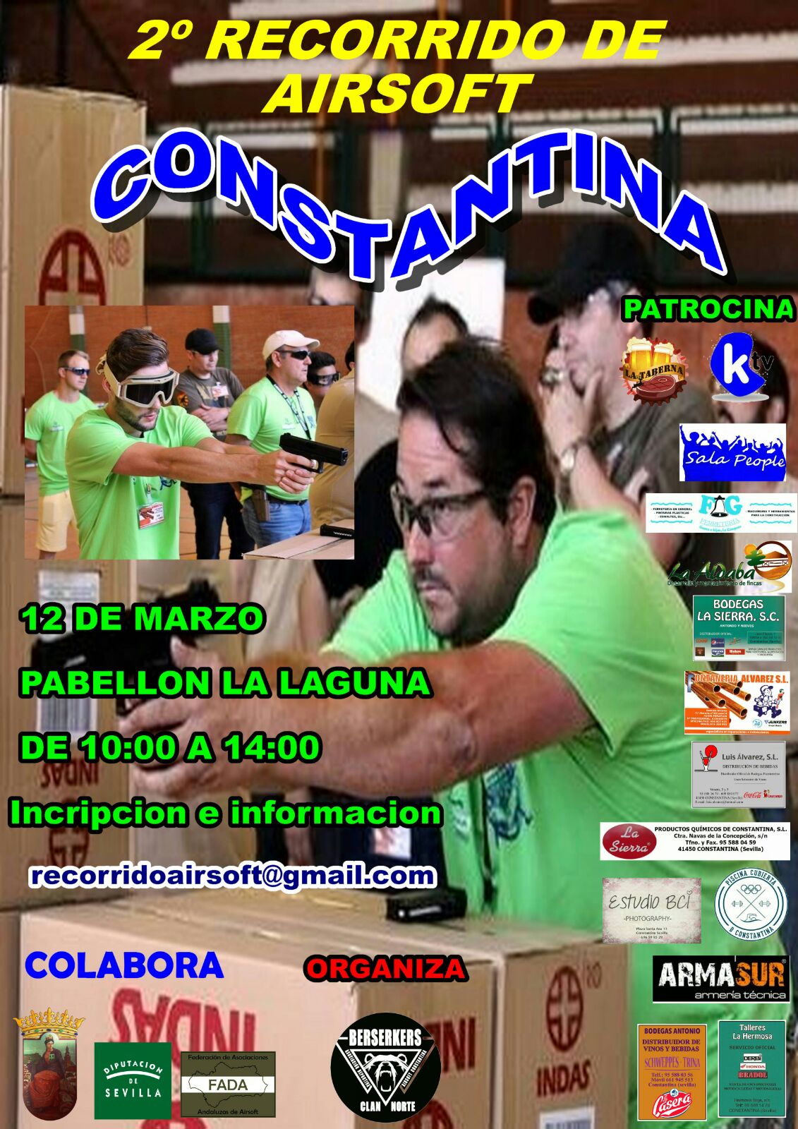 El Ayuntamiento de Constantina y la Federación de Asociaciones Andaluza de Airsoft colaboran con BERSERKERS CLAN NORTE en la organización, el próximo domingo 12 de marzo, del 2º Recorrido Airsoft de nuestro municipio. Este Recorrido Airsoft se desarrollará en el Pabellón Municipal de "La Laguna" de 10:00 a 14:00 horas.