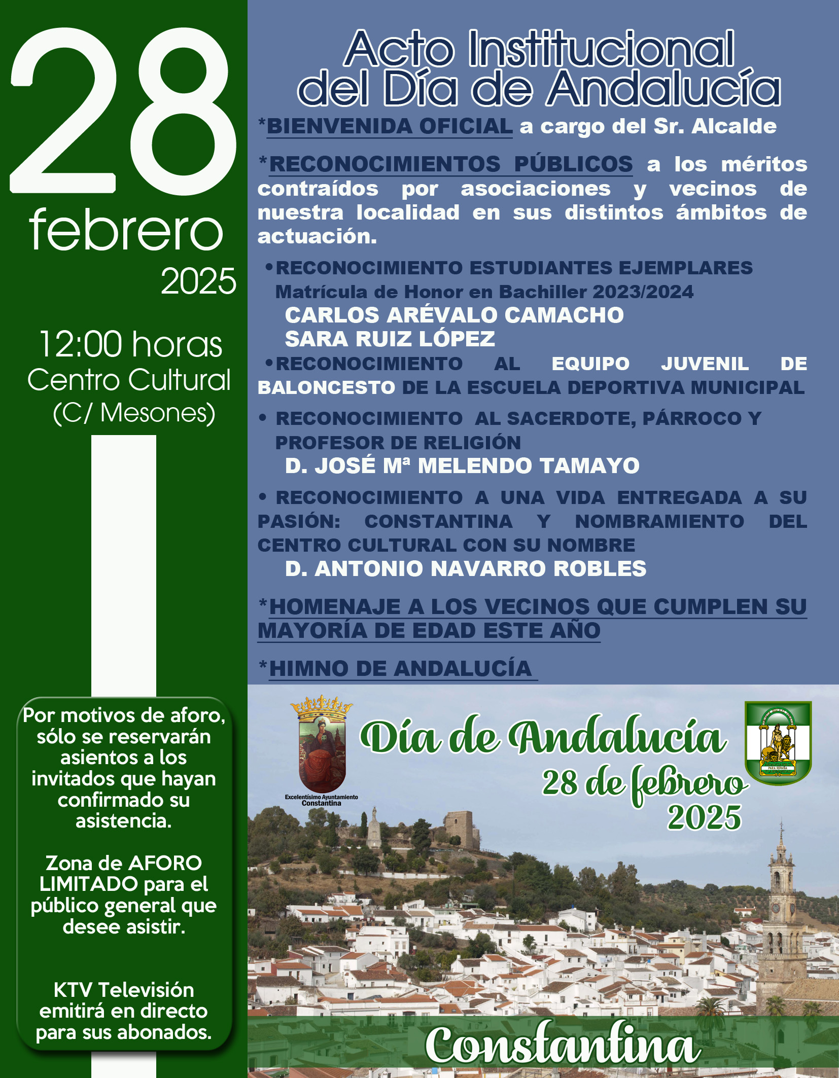 Estos son los actos institucionales programados por el Ayuntamiento de Constantina con motivo del Día de Andalucía el próximo viernes 28 de febrero, a las 12:00 horas, en el Centro Cultural de calle Mesones y durante los cuales serán homenajeados, con un reconocimiento público, vecinos y asociaciones de nuestra localidad.
