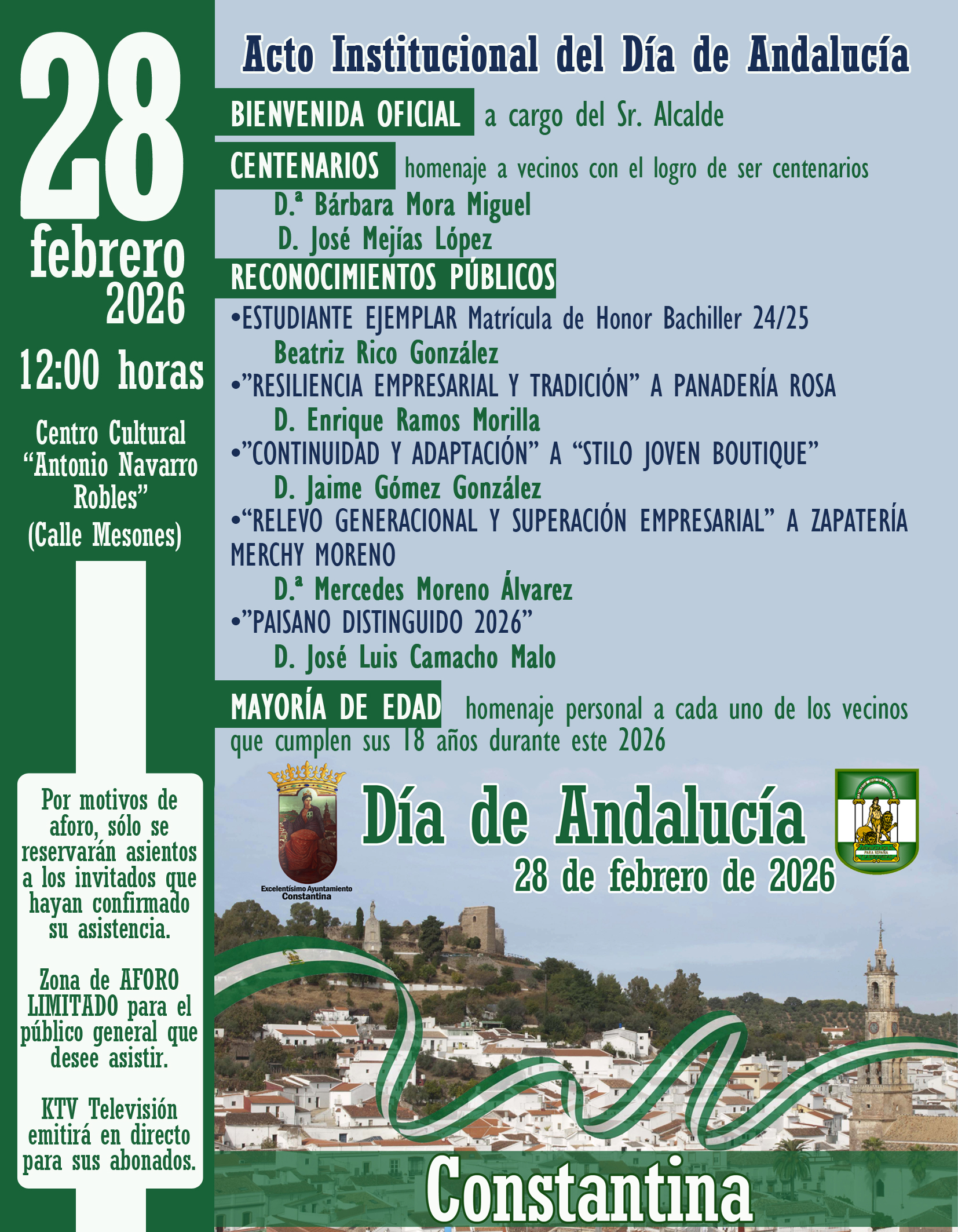 Estos son los actos institucionales programados por el Ayuntamiento de Constantina con motivo del Día de Andalucía el próximo sábado 28 de febrero, a las 12:00 horas , en el Centro "Antonio Navarro Robles" de calle Mesones y durante los cuales serán homenajeados, con un reconocimiento público, vecinos de nuestra localidad por sus distintos méritos demostrados.