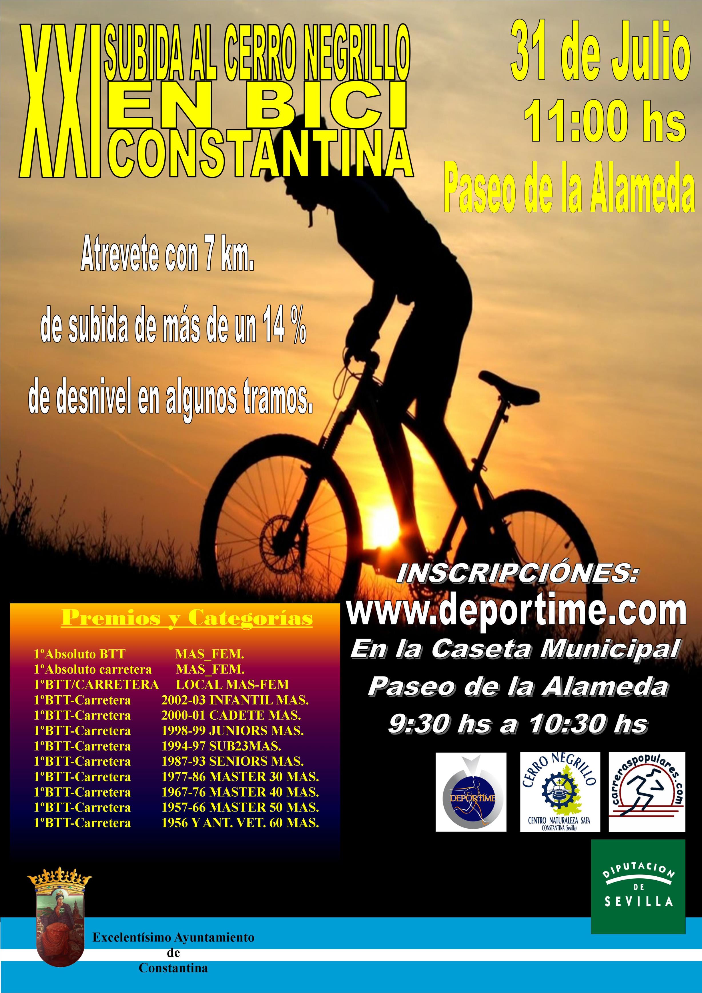 El próximo domingo 31 de julio tendrá lugar, a las 11:00 horas, la XXI Subida al Cerro Negrillo en Bicicleta, organizada por la Delegación de Deportes del Ayuntamiento de Constantina en colaboración con la Diputación de Sevilla.