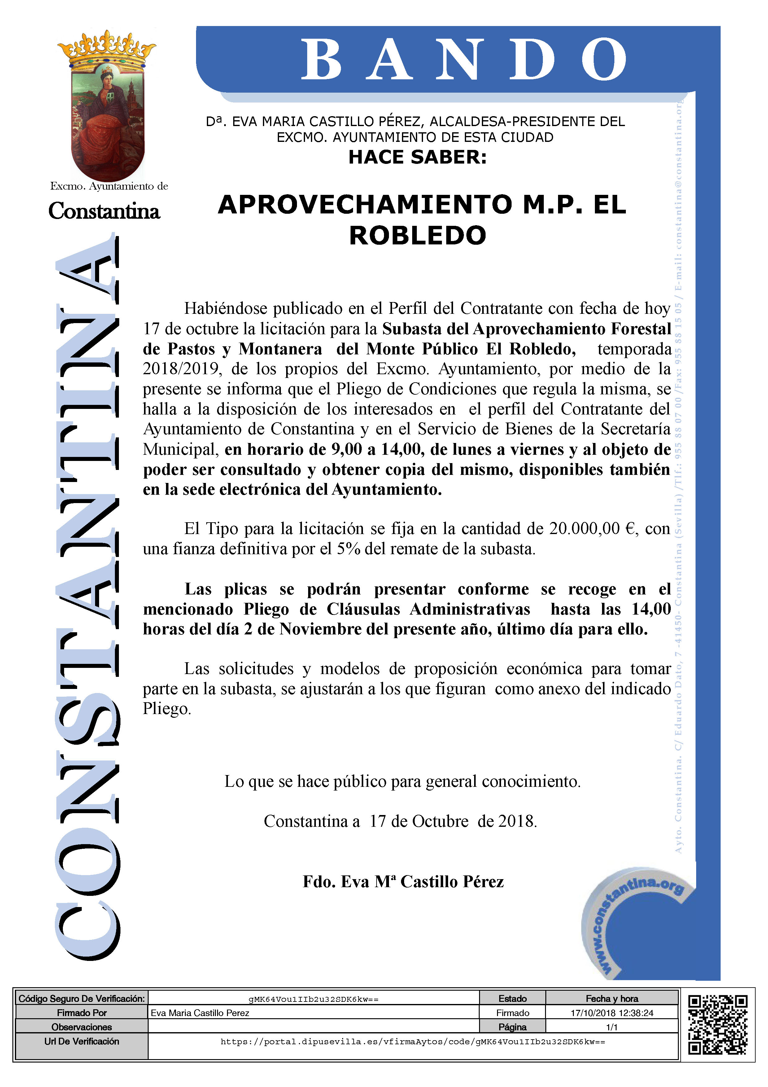 Se hace público el anuncio relativo al aprovechamiento de pastos y montanera para la temporada 2018/2019 del Monte Público "El Robledo", propiedad del Ayuntamiento de Constantina. Las plicas se podrán presentar hasta las 14:00 horas del viernes 2 de noviembre en la Secretaría Municipal.
