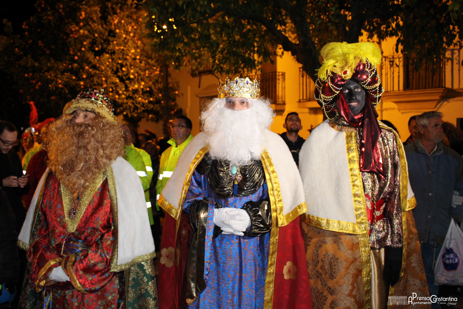 Los tres Reyes llegaban a pie a la nave "Pepe Cabrera", sede de CREMA, para ocupar los bellos tronos que esta asociación les había preparado para recorrer las calles de Constantina, cuando ya el resto de carrozas estaban ocupadas por los respectivos cortejos: cientos de niños y mayores llenos de colorido y alegría a los que les quedaba por delante un largo recorrido para visitar las distintas barriadas constantinenses, ayudando a Melchor, Gaspar y Baltasar a repartir caramelos, juguetes, regalos y, sobre todo, ilusión.