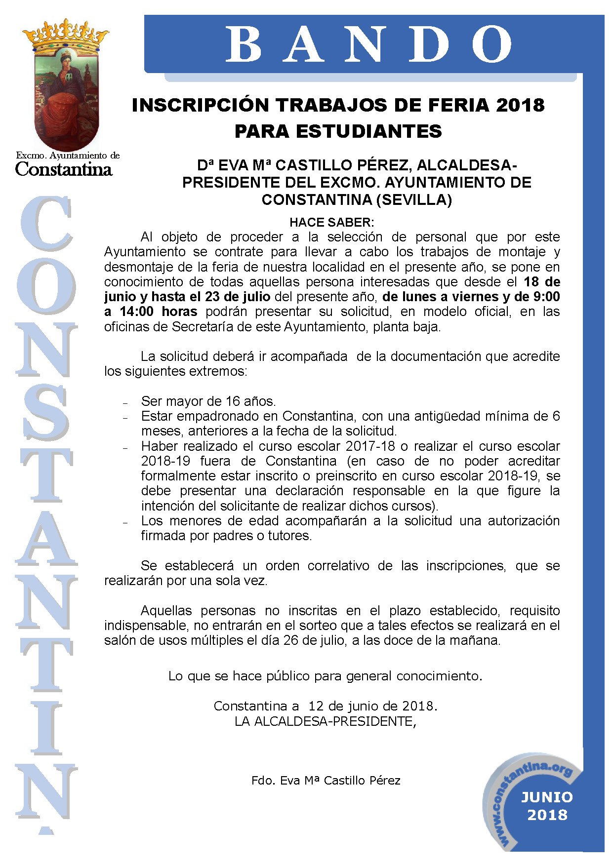* Estar empadronado en Constantina, con una antigüedad mínima de 6 meses,