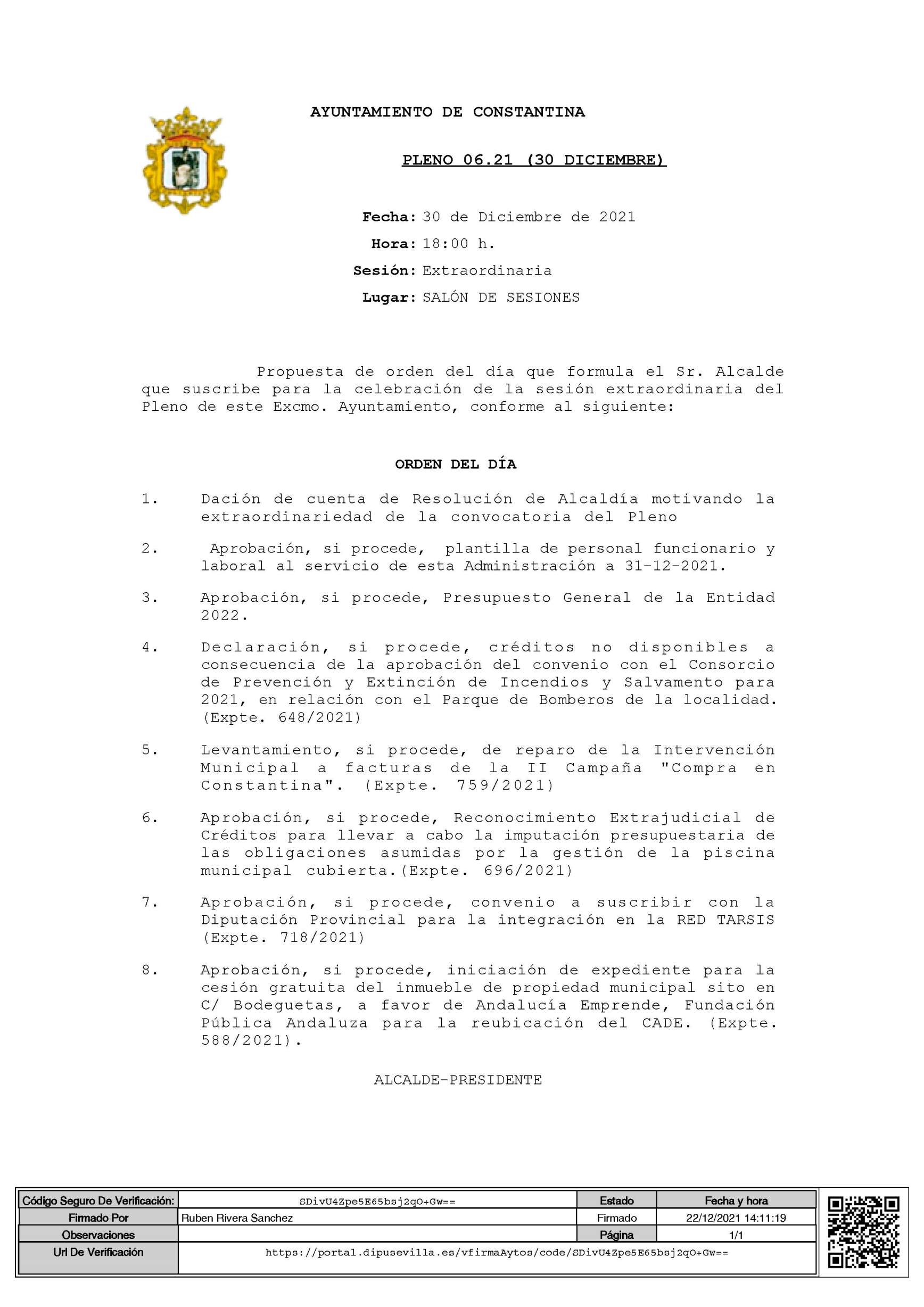 CONVOCATORIA DE SESIÓN EXTRAORDINARIA PLENO CONSTANTINA