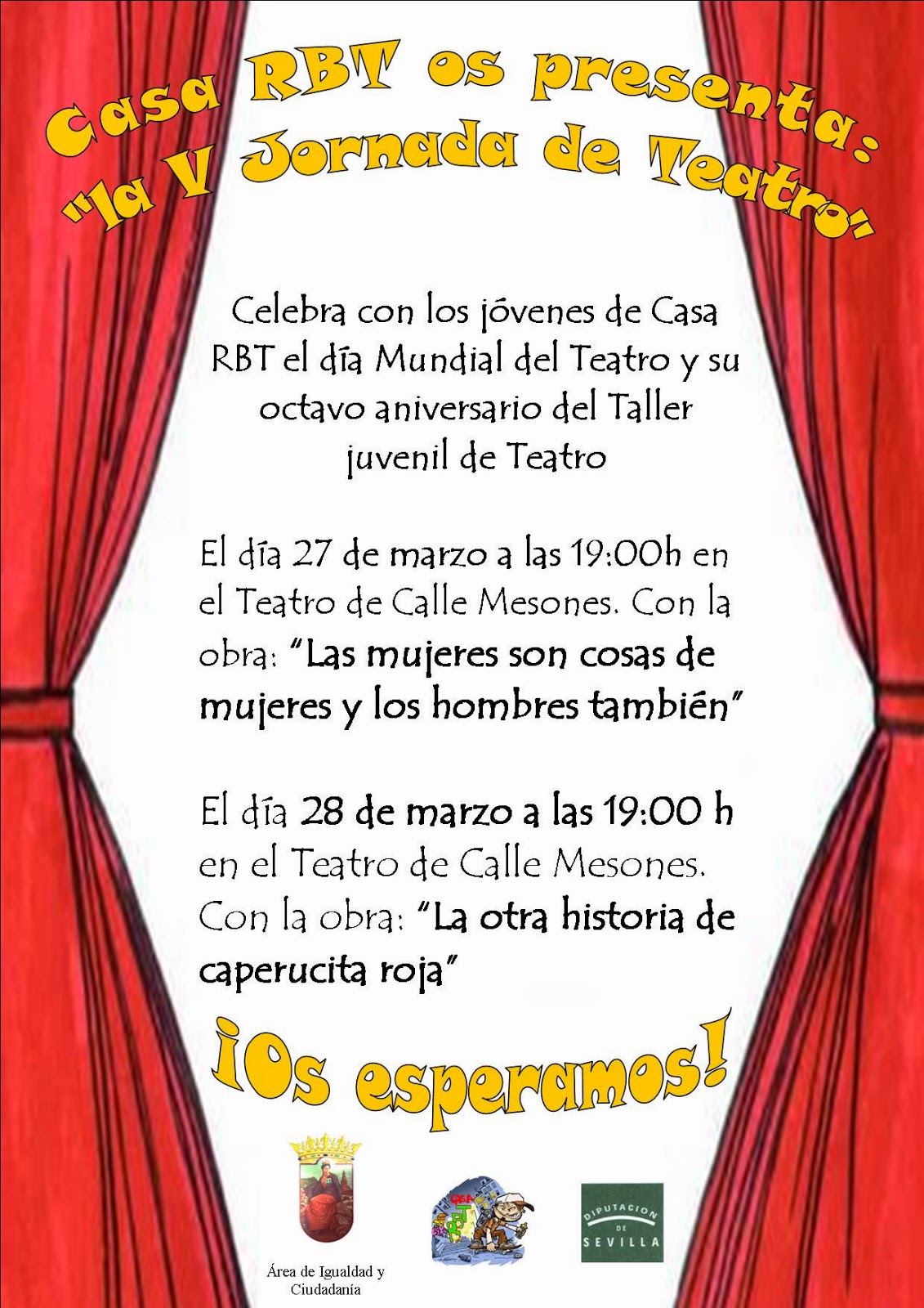 Los jóvenes de Casa RBT os invitan a la V Jornada de Teatro, con motivo del Día Mundial del Teatro y de su octavo aniversario como grupo juvenil teatral.