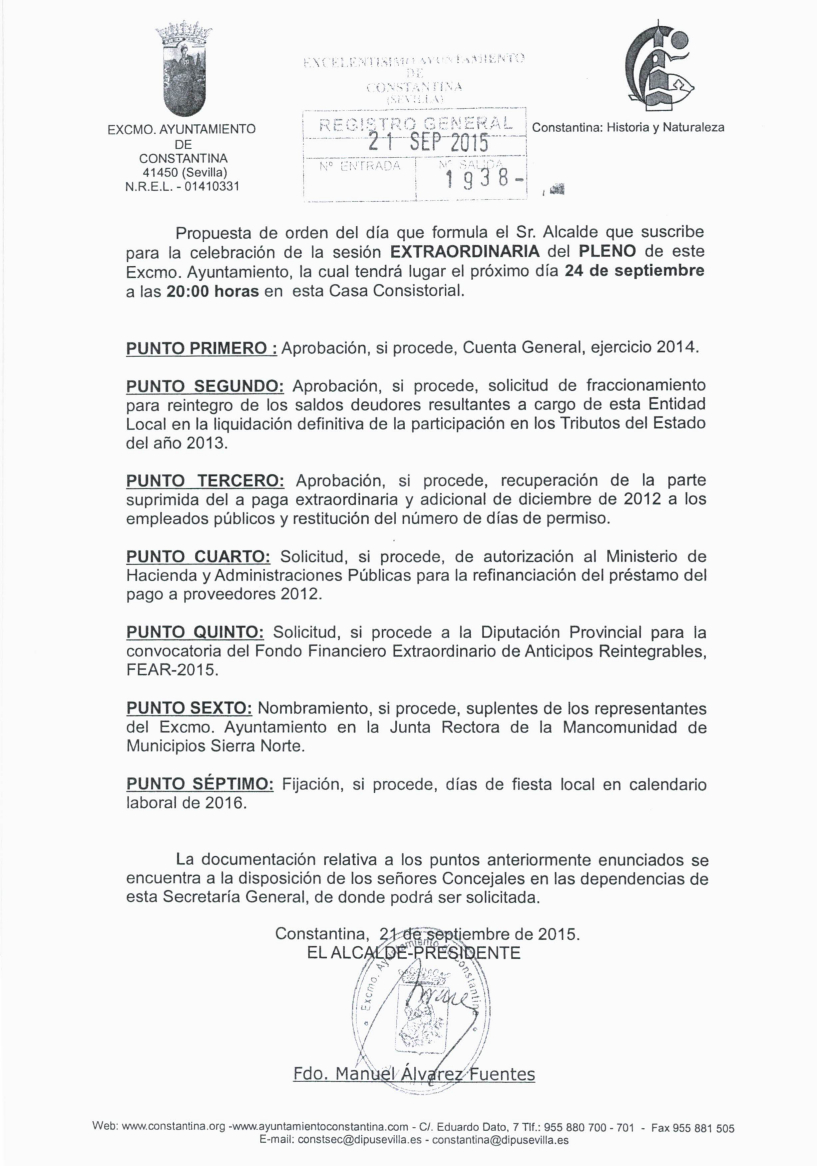 Convocatoria Pleno Extraordinario 24 de septiembre de 2015 a las 20:00 horas