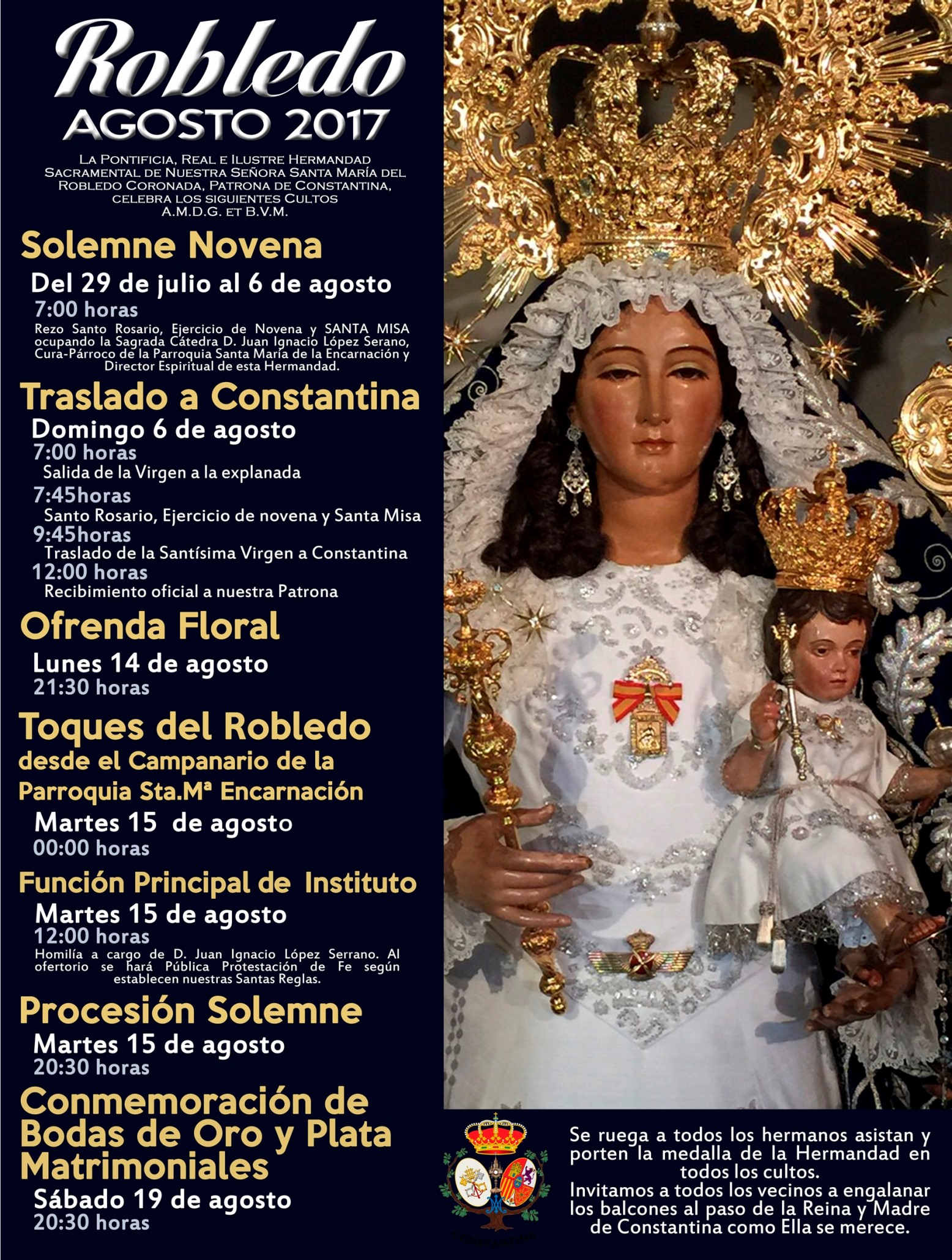 La Pontificia, Real e Ilustre Hermandad Sacramental de Nuestra Señora Santa María del Robledo Coronada, celebrará en honor a la Patrona de Constantina los siguientes cultos en el mes de agosto. Constantina con su Patrona, Reina y Madre.