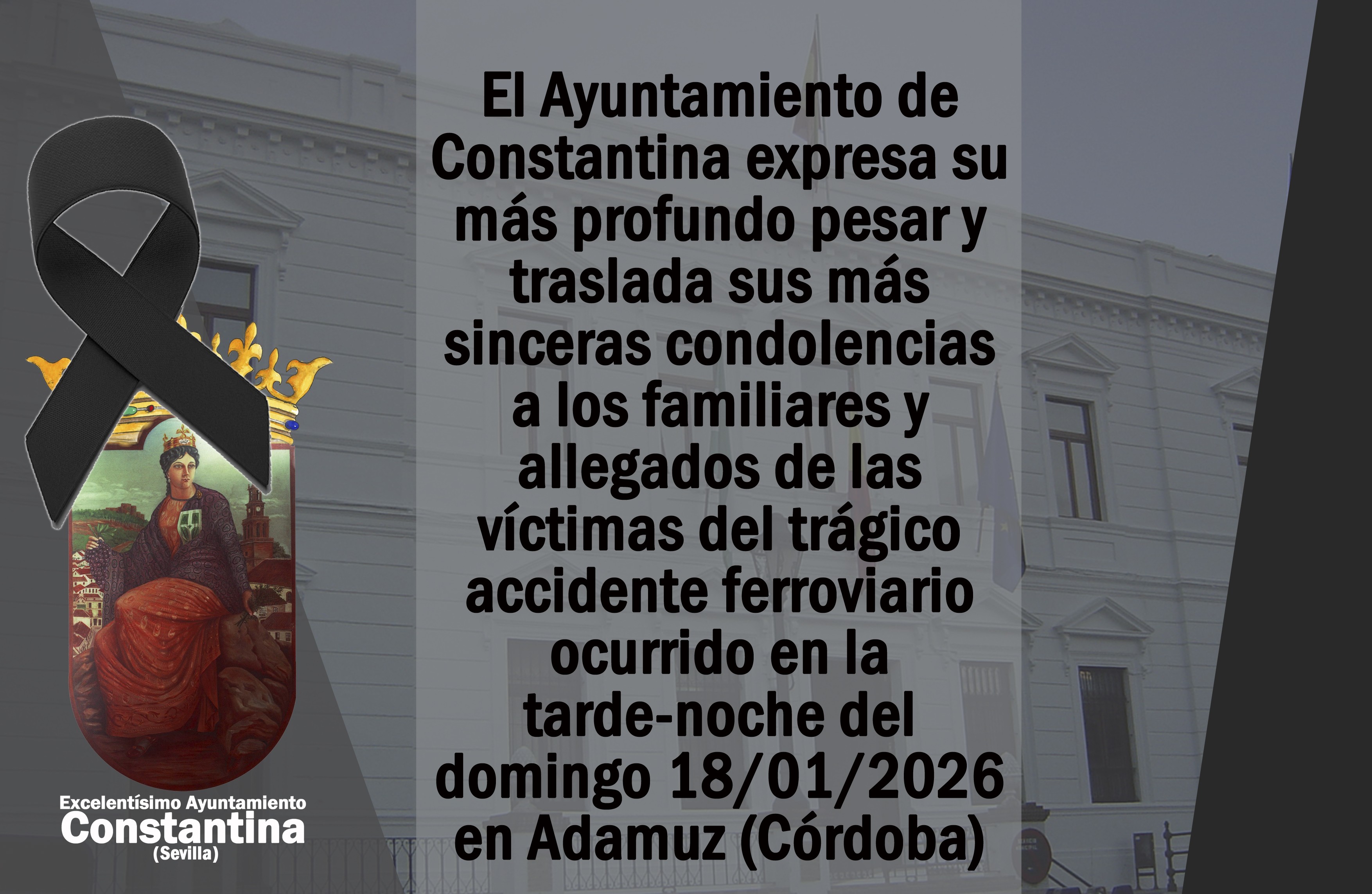 El Ayuntamiento de Constantina (Sevilla) se suma al luto oficial de tres días decretado por el Gobierno de España y la Junta de Andalucía en señal de respeto y duelo por las víctimas del accidente ferroviario ocurrido el domingo 18/01/2026 en Adamuz (Córdoba) y en manifestación de apoyo y solidaridad con sus familias.