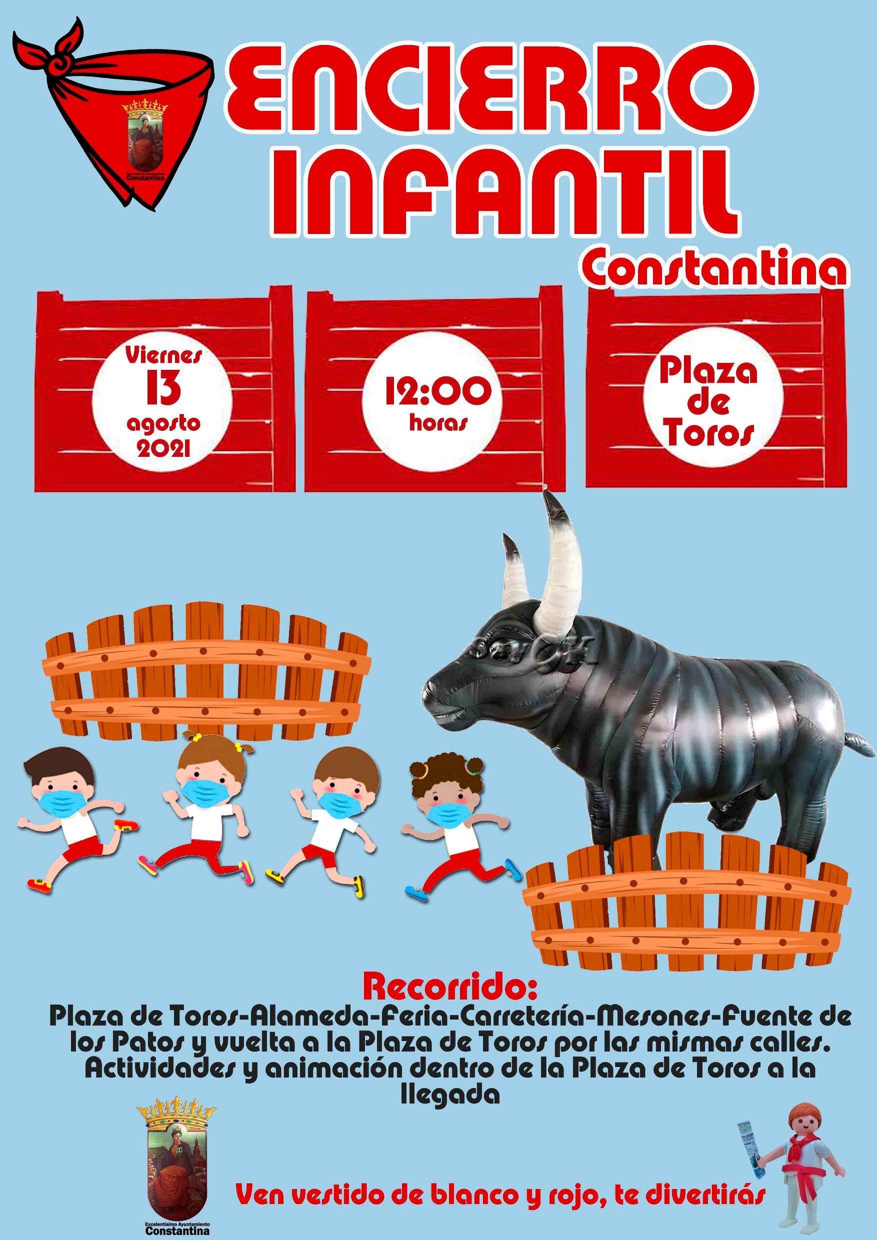 El Ayuntamiento de Constantina te trae el viernes 13 de agosto, a las 12:00 horas, un "Encierro Infantil”, un divertido show itinerante, que representa un encierro como los de San Fermín, pero con la peculiaridad de que los toros son muñecos hinchables o muñecos, por lo tanto, no son peligrosos sino divertidos. Podrán participar todos los niños que los deseen, sólo hay que estar a las 12:00 en la Plaza de Toros, si puedes o quieres vestido de blanco y rojo.