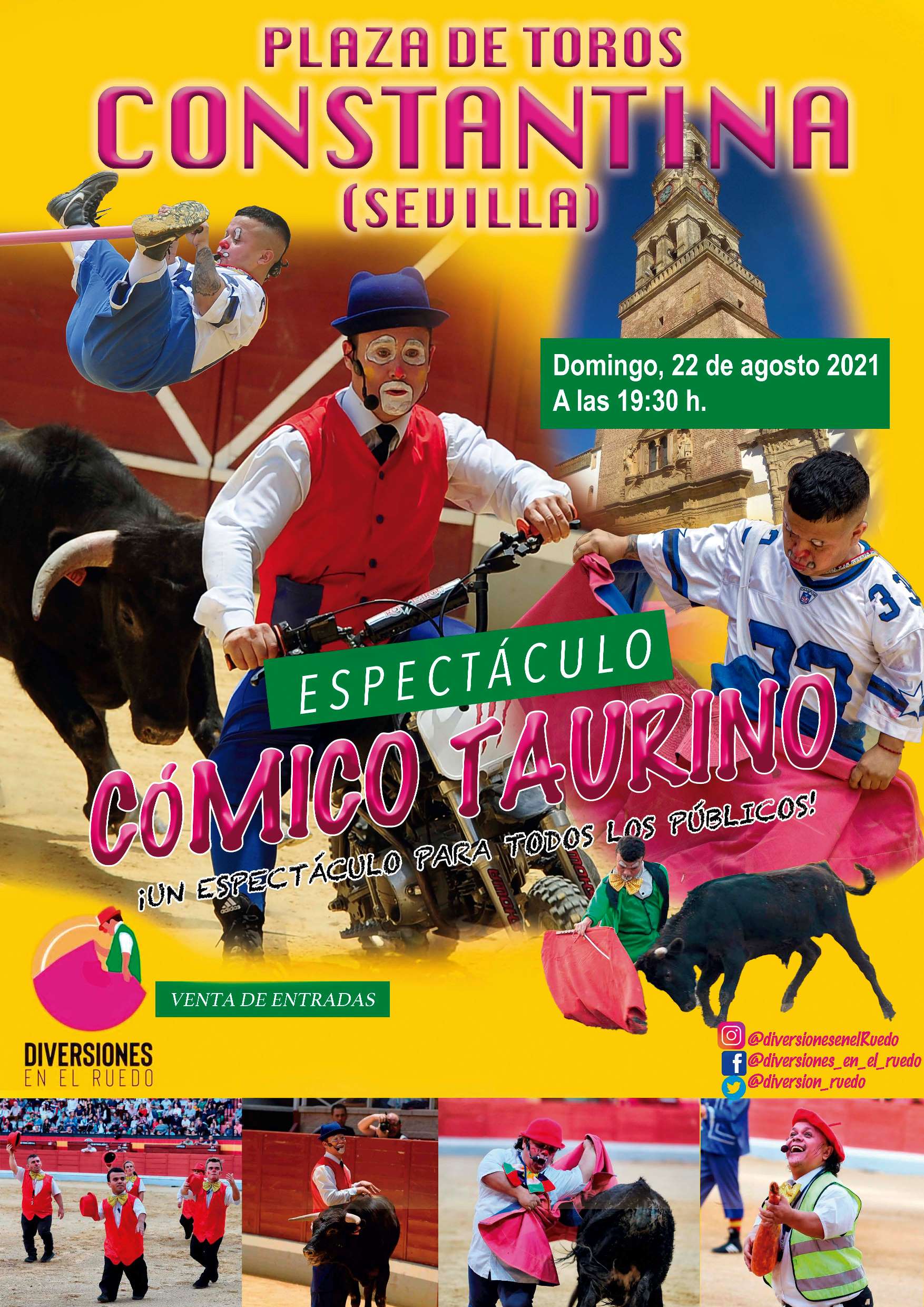 Organizado por Euro Tauro Luján, S.L. en colaboración con el Ayuntamiento de Constantina, el próximo domingo 22 de agosto, a las 19:30 horas en la Plaza de Toros de Constantina, se celebrará a cargo de la Cuadrilla Diversiones en el Ruedo un Espectáculo Cómico-Taurino para todos los públicos.