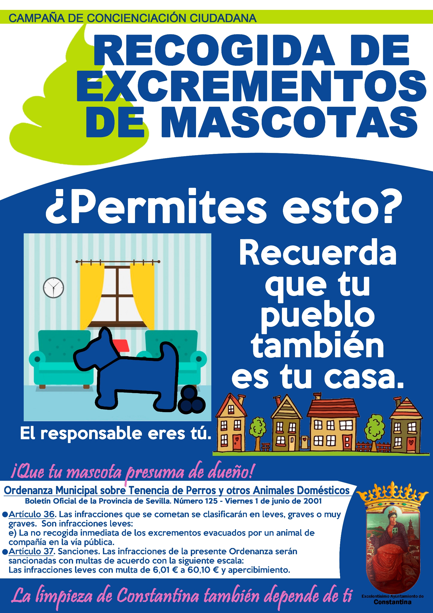 Bajo el slogan "Que tu mascota presuma de dueño. El responsable eres tú", el Ayuntamiento de Constantina lanza una campaña para la concienciación sobre la recogida de excrementos de los animales en la vía pública. Para ello, entre otras acciones, se repartirá cartelería concienciadora por distintos emplazamientos de la localidad. Esta difusión se reforzará en las redes sociales municipales y también se llevarán a cabo distintas actividades como reparto de bolsas especiales para la recogida de excrementos entre la ciudadanía dueña de mascotas y más material divulgativo.