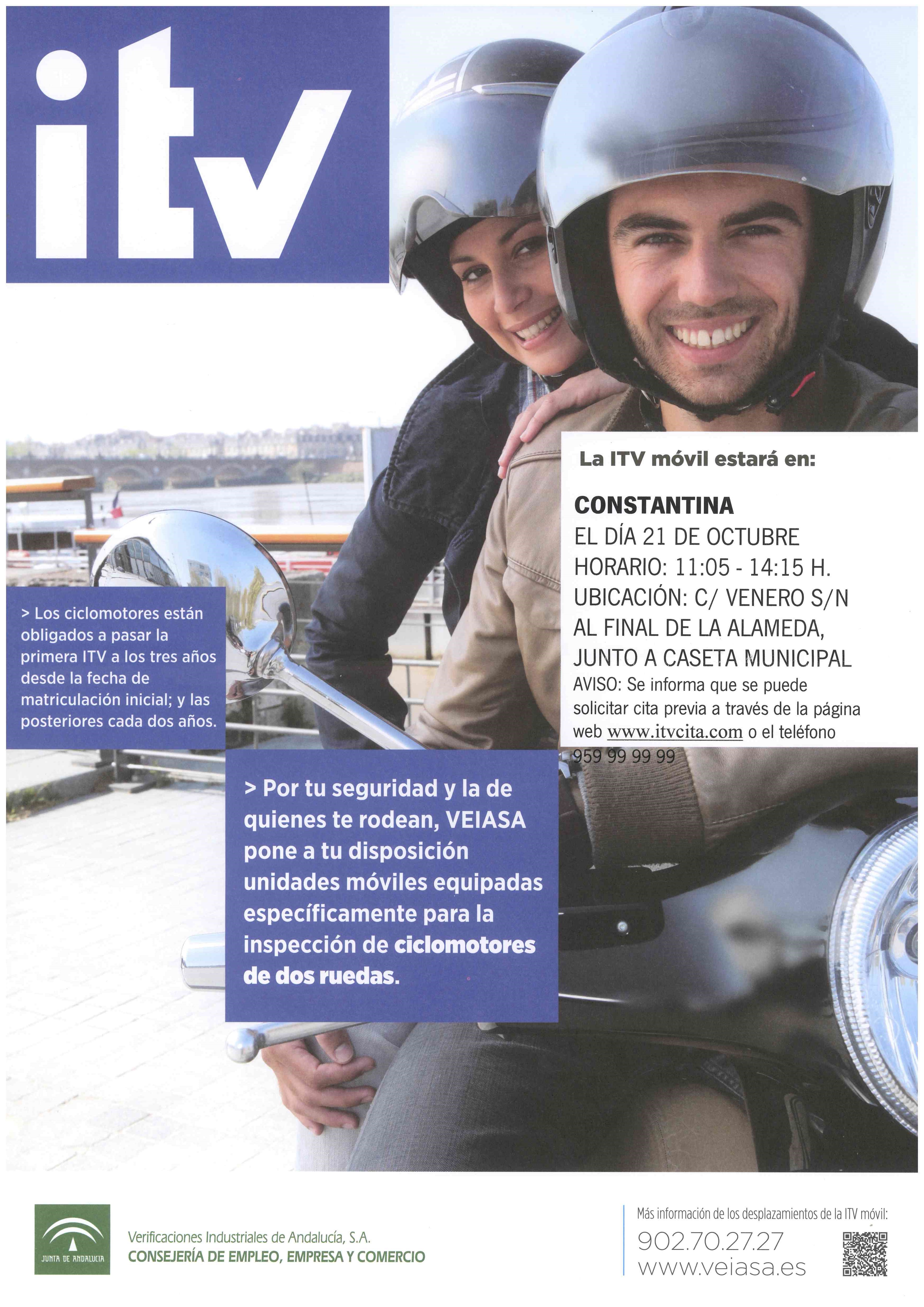 ITV móvil: los cilcomotores están obligados a pasar la primera ITV a los tres años desde la fecha de matriculación inicial y las posteriores cada dos años. Puede solicitarse cita previa a través de la página web www.itvcita.com o en el teléfono 959 99 99 99