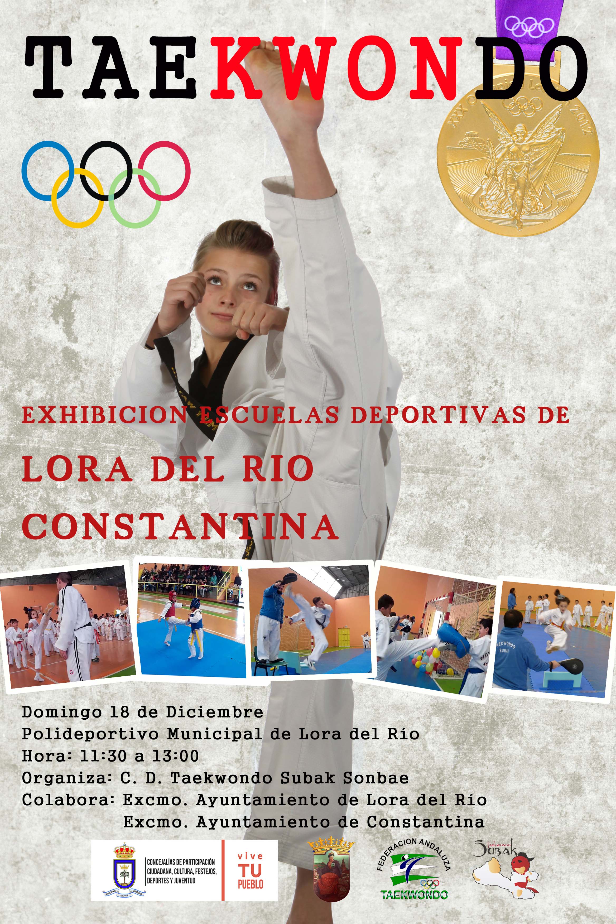 El próximo domingo 18 de diciembre tendrá lugar en el Polidepoortivo Municipal de Lora del Río una Exhibición de las Escuelas Deportivas de Taekwondo de Constantina y Lora del Río. Esta actividad está programada de 11:30 a 13:00 horas y está organizada por el C.D. Taekwondo Subak Sonbae, con la colaboración de los Ayuntamientos de Lora del Río y de Constantina.