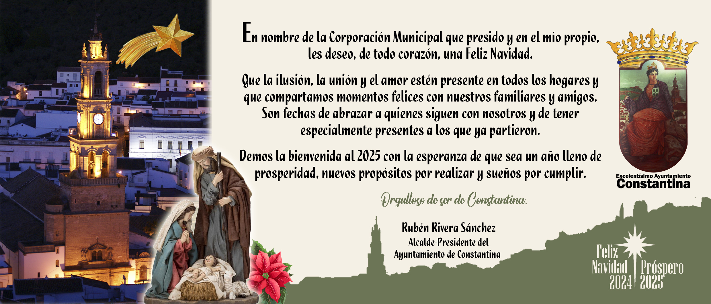 El alcalde de Constantina, Rubén Rivera, en nombre de la Corporación Municipal del Ayuntamiento que preside y en el suyo propio, os desea a todos Feliz Navidad, que la ilusión y la alegría estén presente en todos los hogares y que compartamos momentos felices con nuestros familiares y amigos.
