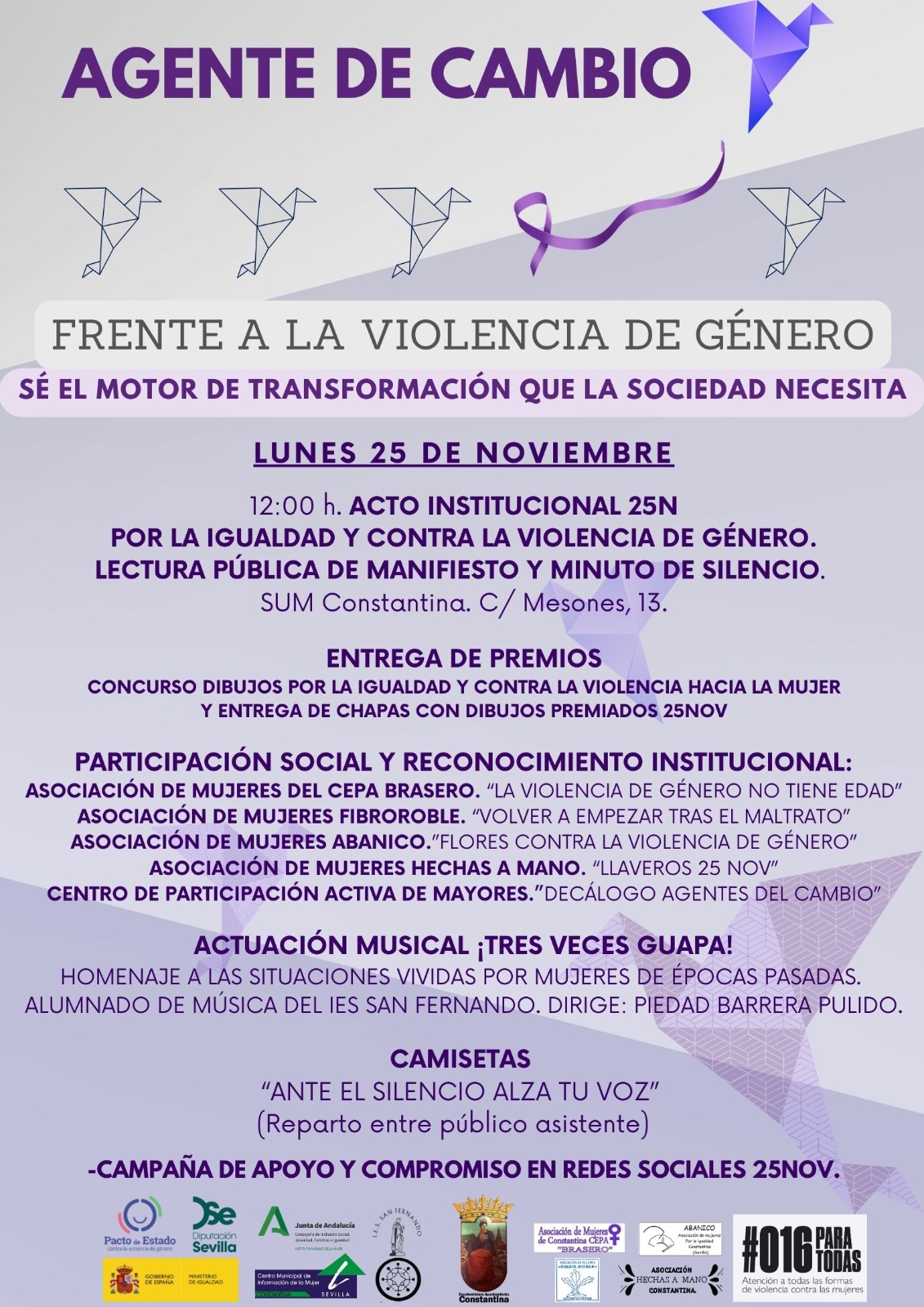 Dentro de las actividades programadas con motivo del 25-N Día Internacional contra la violencia de género, el Centro Municipal de la Mujer del Ayuntamiento de Constantina organiza hoy lunes 25 de noviembre, a las 12:00 horas, en el Salón de Usos Múltiples, el Acto Institucional que incluirá la lectura del Manifiesto y minuto de silencio a cargo de la primera teniente de alcalde y delegada de Igualdad, Sonia Ortega.