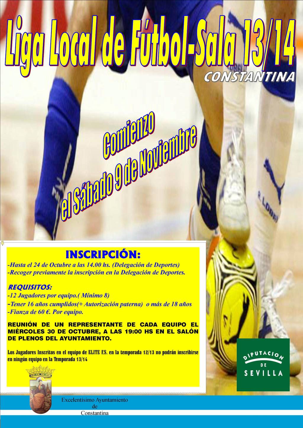 Hasta el jueves 24 de octubre, a las 14:00 horas, permanecerá abierto el plazo de inscripción para competir en la Liga Local de Fútbol-Sala de Constantina 2013/2014, organizada por la Delegación de Deportes del Ayuntamiento de la localidad.