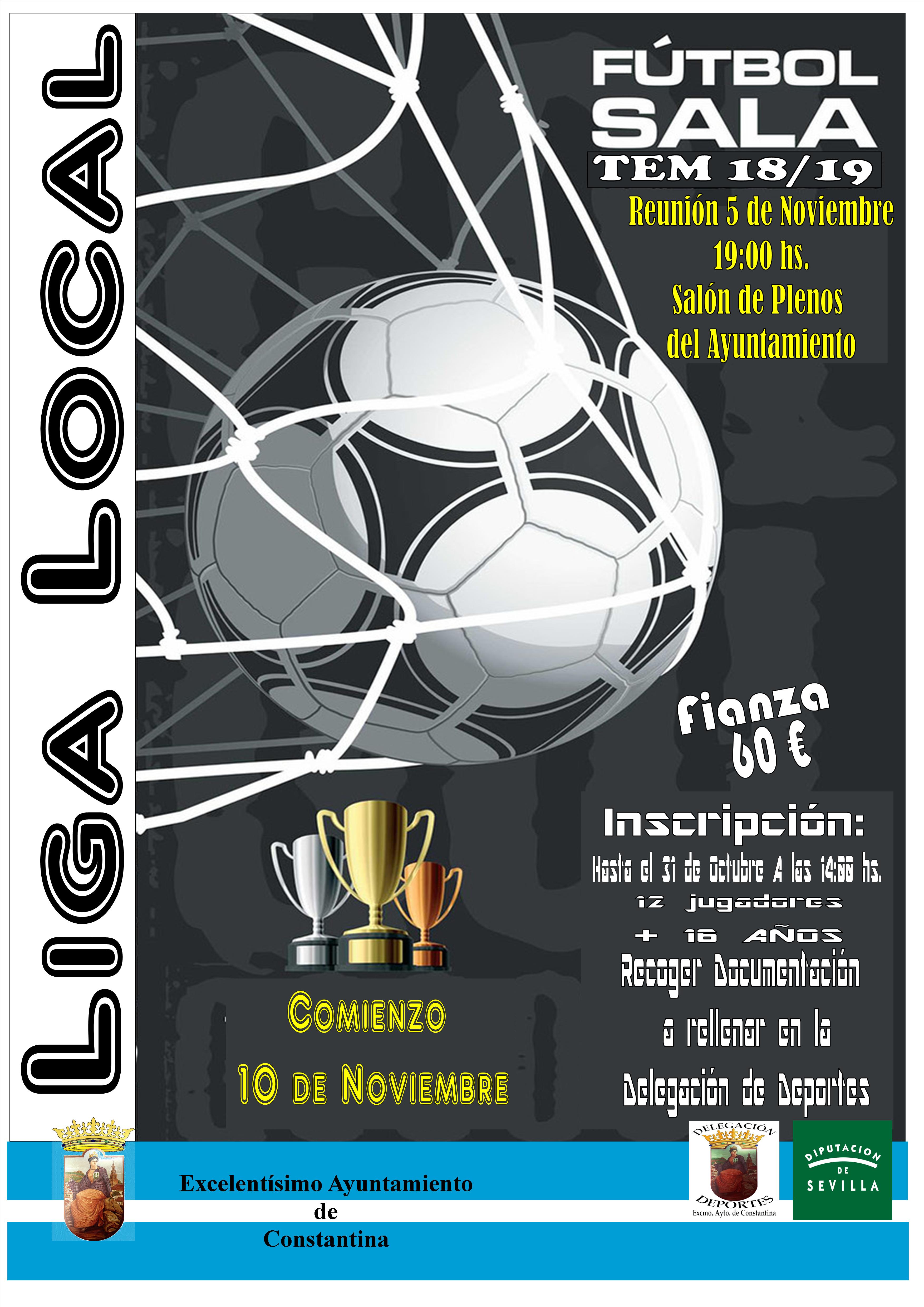 Hasta el miércoles 31 de octubre, a las 14:00 horas, permanecerá abierto el plazo de inscripción para competir en la Liga Local de Fútbol-Sala de Constantina 2018/2019, organizada por la Delegación de Deportes del Ayuntamiento de la localidad.