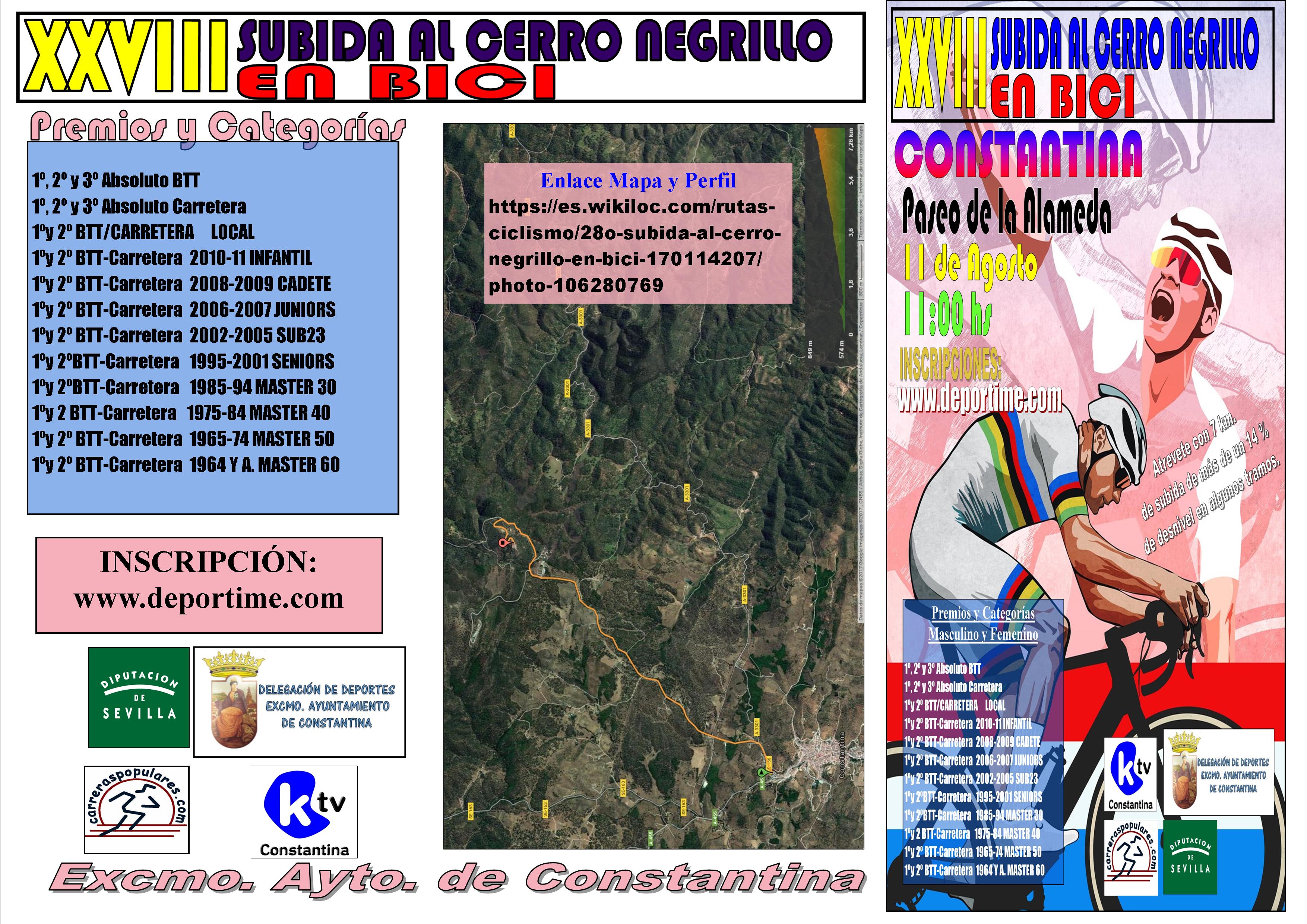 El próximo domingo 11 de agosto tendrá lugar, a las 11:00 horas, la XXVIII Subida al Cerro Negrillo en Bicicleta, organizada por la Delegación de Deportes del Ayuntamiento de Constantina en colaboración con la Diputación de Sevilla.