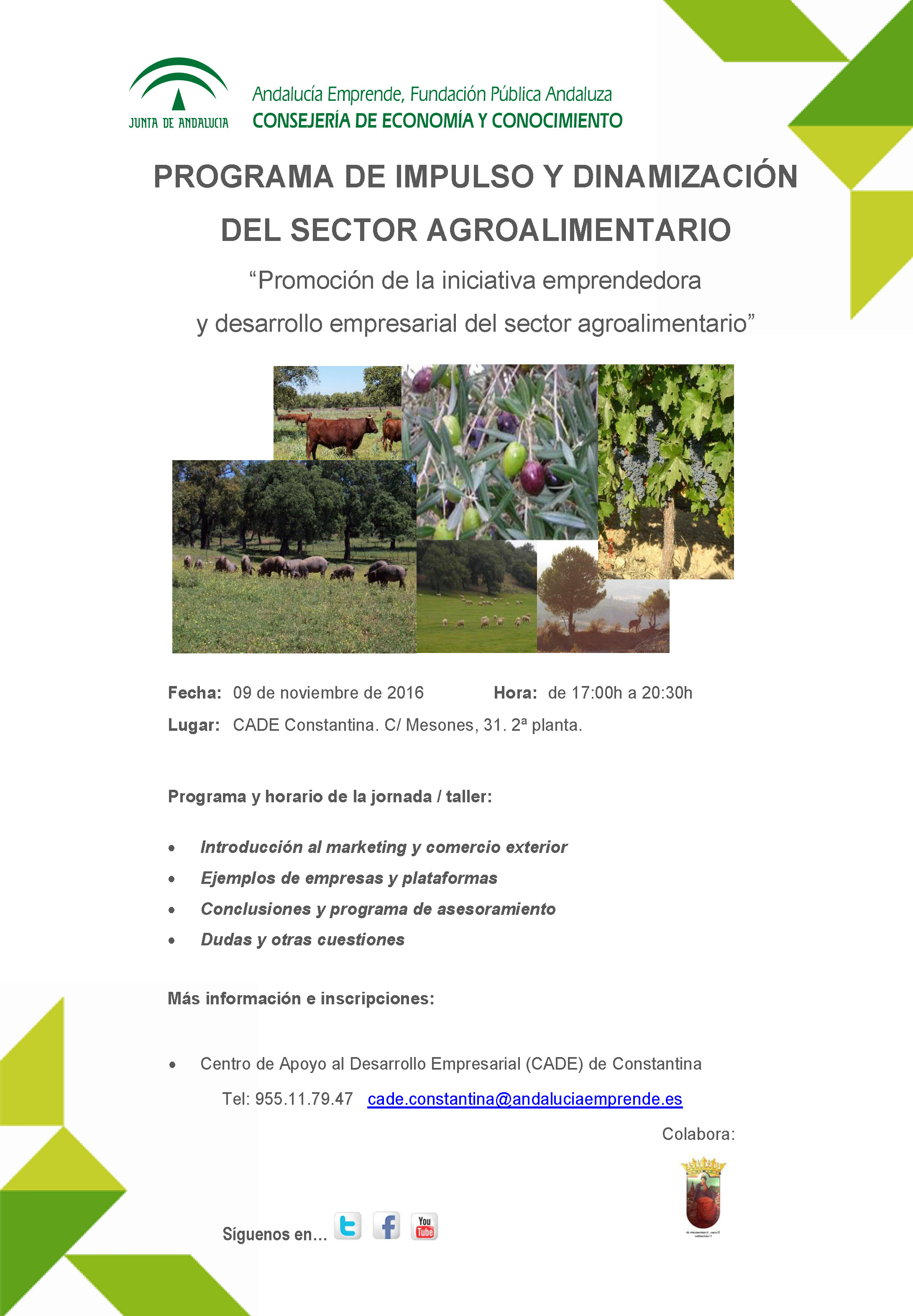 La Consejería de Economía y Conocimiento, a través de Andalucía Emprendre, organiza esta jornada que se enmarca dentro del Programa de Impulso y Dinamización del Sector Agroalimentario. El Centro de Apoyo al Desarrollo Empresarial (CADE) de Constantina se encarga de organizarlas en el salón de calle Mesones, 31