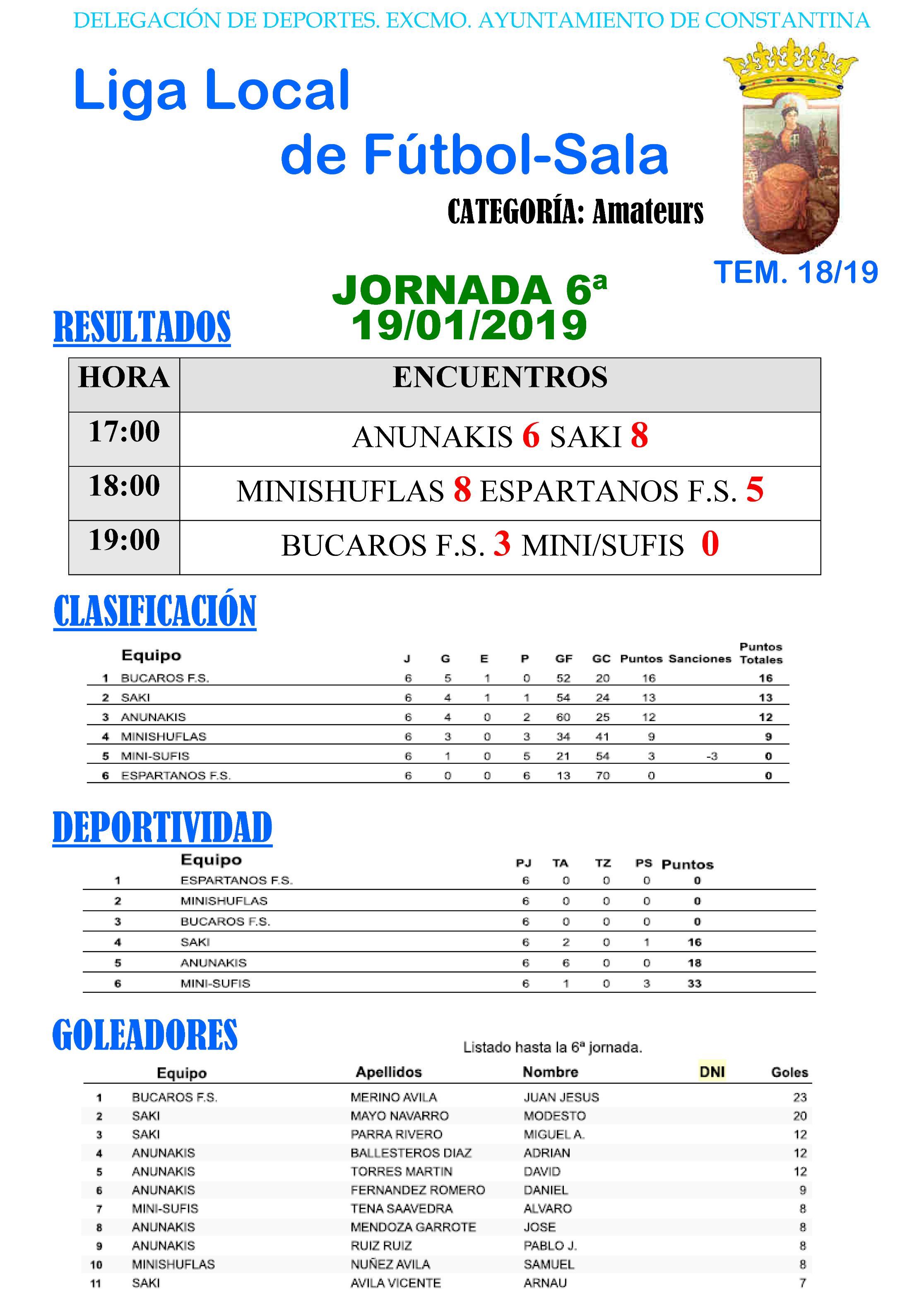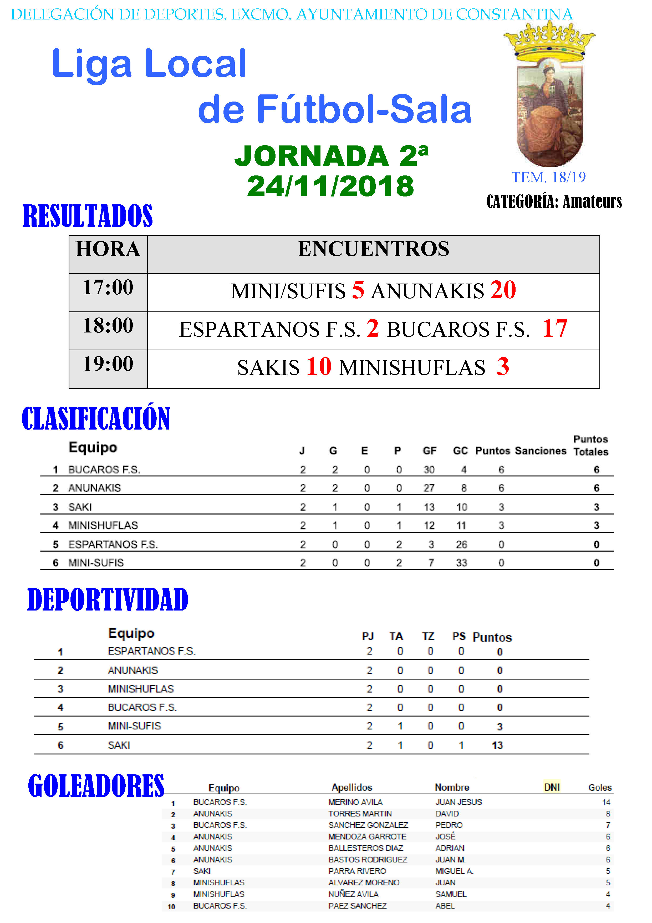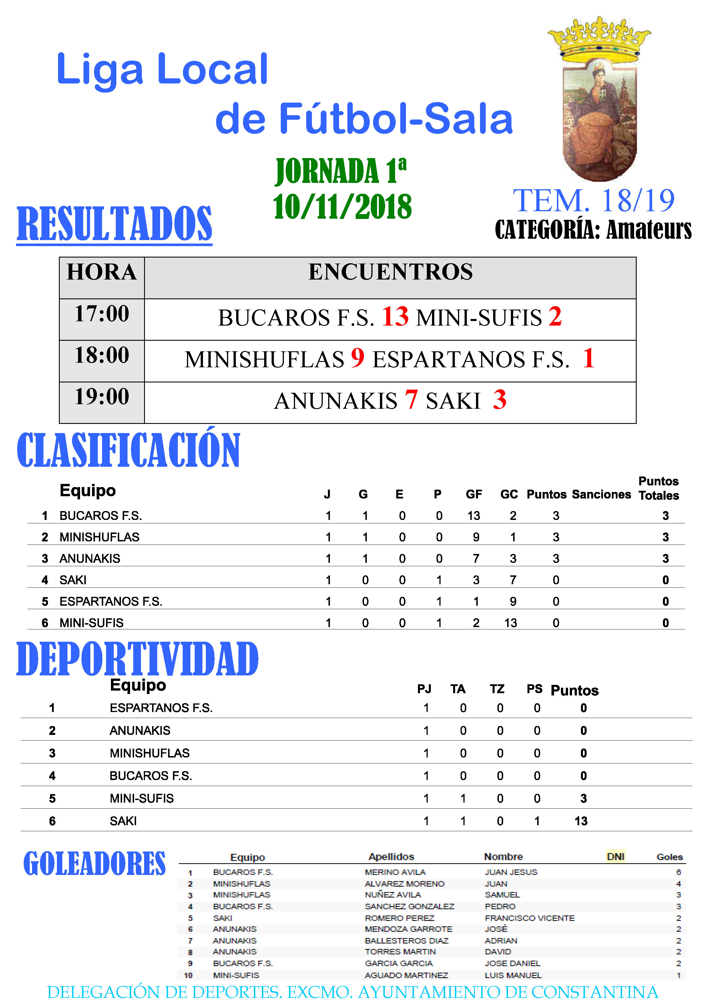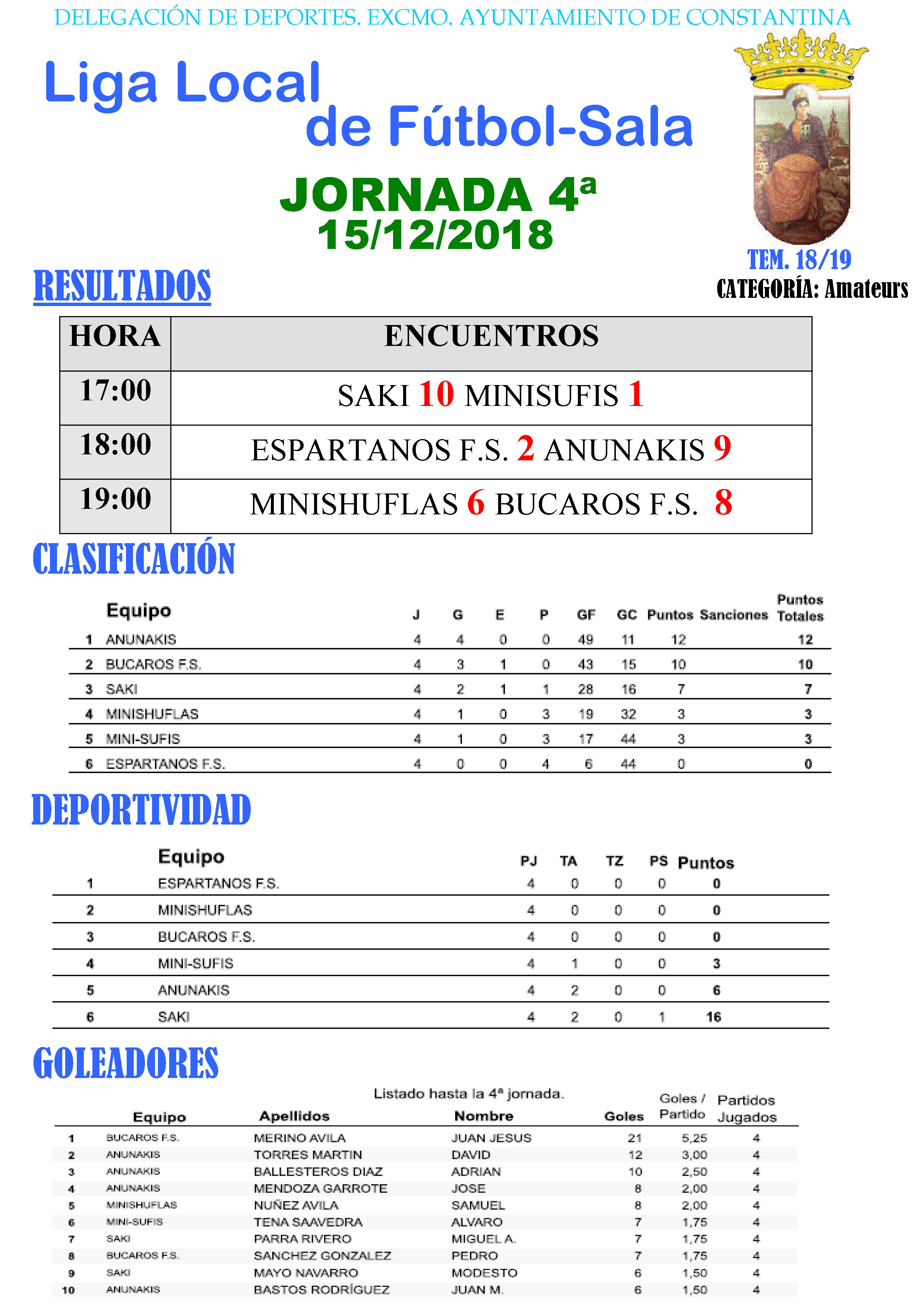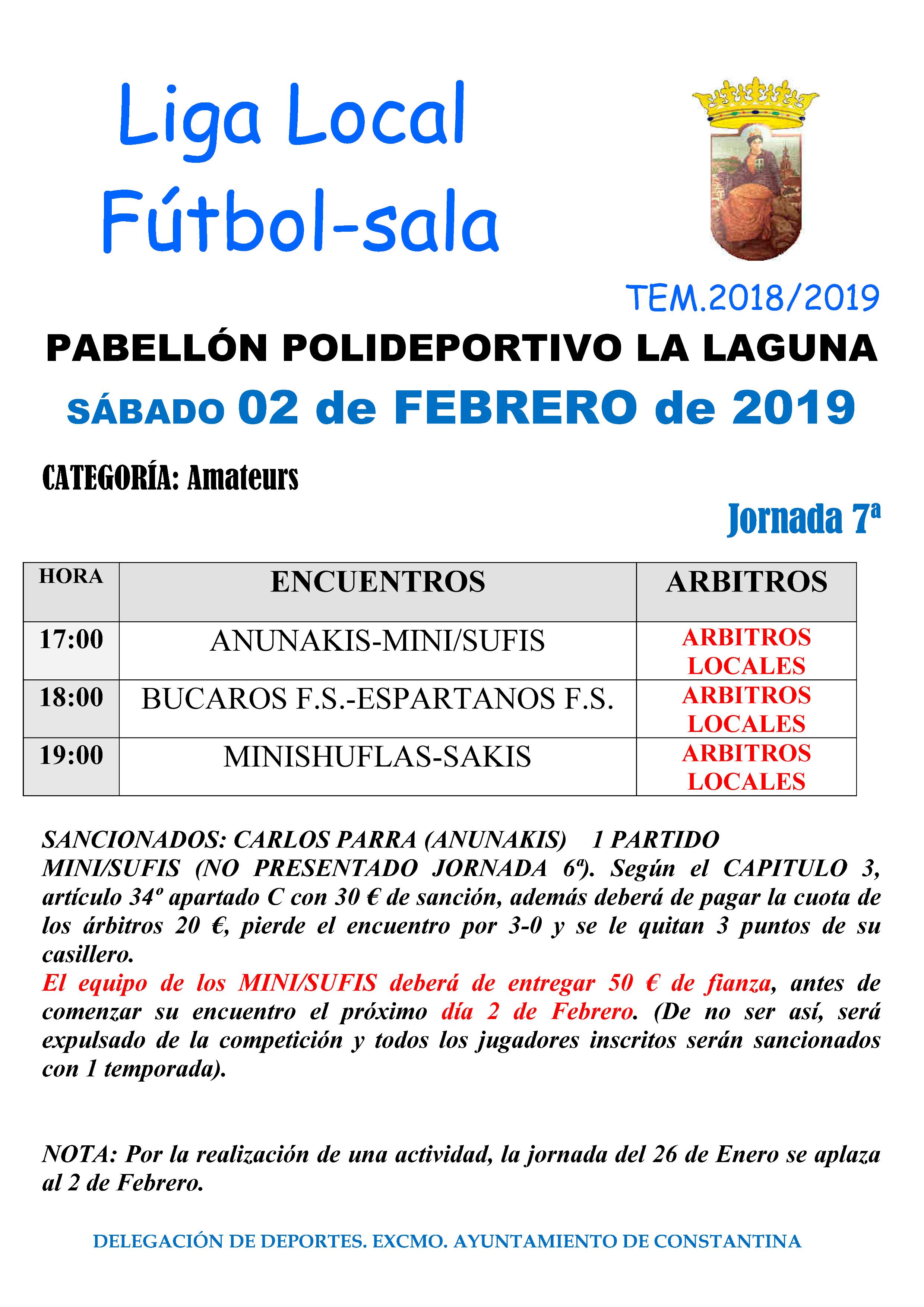 Os traemos el calendario y las jornadas de la Liga Local de Fútbol-Sala Constantina 2018/2019 organizada por la Delegación de Deportes del Ayuntamiento de Constanitna y que se disputa en el Polideportivo "La Laguna" los sábados en horario de tarde.