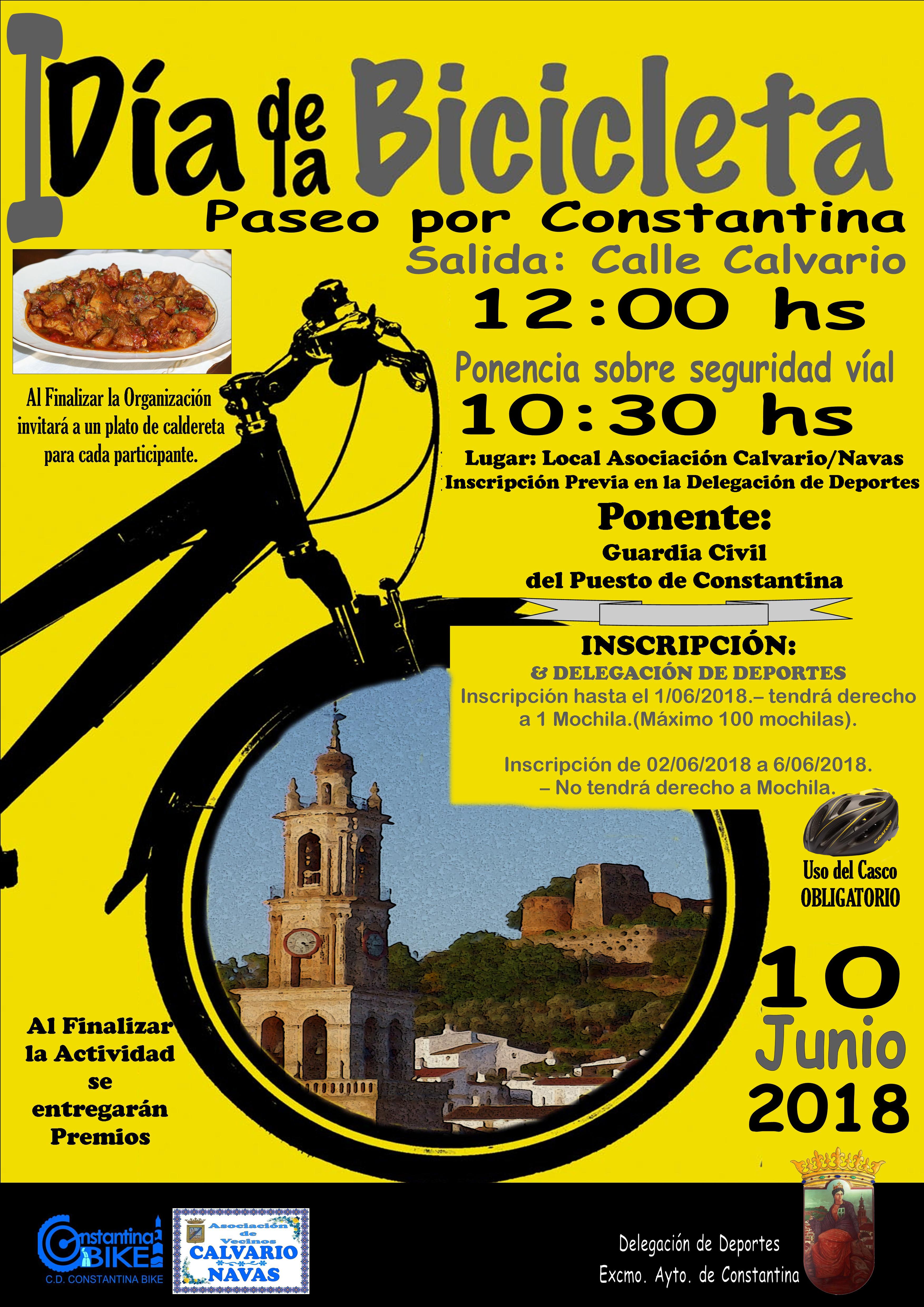 Organizado por la Delegación de Deportes del Ayuntamiento en colaboración con el Club Deportivo Constantina Bike y la Asociación de Vecinos Calvario-Navas, el Día de la Bicicleta comenzará a las 10:30 horas en el local de la Asociación del Calvario-Navas con una ponencia sobre seguridad vial a cargo de la Guardia Civil del Puesto de Constantina, con recomendaciones útiles para la actividad en sí y para circular en bicicleta, en general.