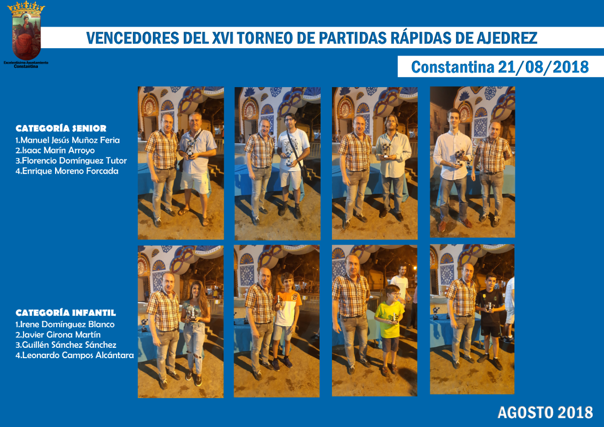 Organizado por la Delegación de Deportes del Excelentísimo Ayuntamiento de Constantina el pasado, martes 21 de agosto, a las 21:00 horas, se celebró el tradicional Torneo de Partidas Rápidas de Ajedrez "Ciudad de Constantina". Delante del arco de la Feria, su peculiar lugar de celebración, se congregaban 28 participantes para disputar partidas rápidas de ajedrez a 8 rondas, con sucesivos emparejamientos según resultados. Los finalistas fueron: