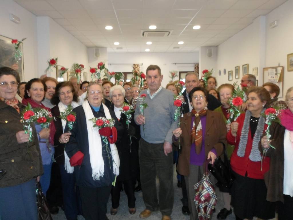 A la entrada cada participante fue obsequiado con un clavel rojo, por cortesía del Centro. Lo recibieron de la mano de Aurora Camargo, en calidad de Presidenta, siendo ayudada ésta por una compañera de la Junta Directiva, Ana Mª Parra y un socio, Rafael Melgarejo .
