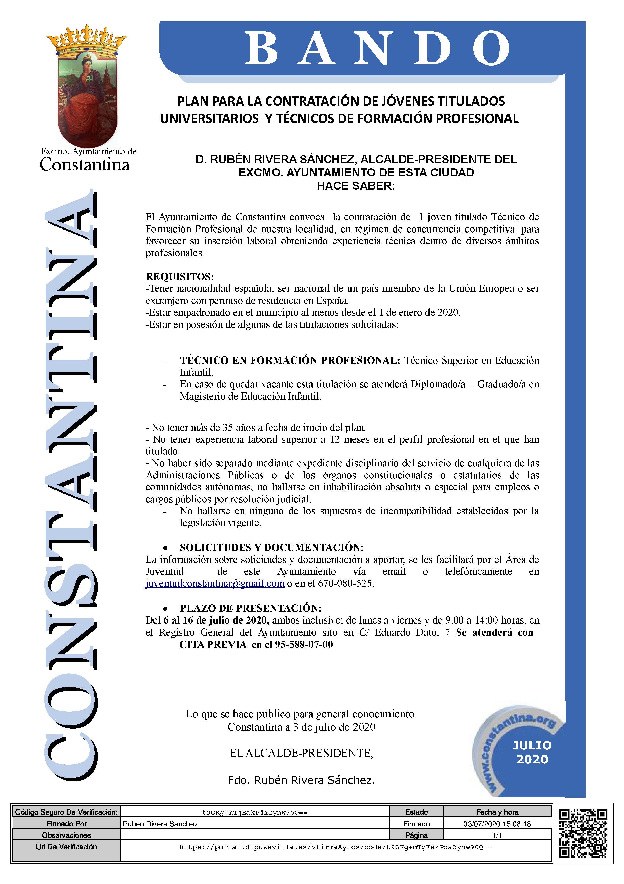 PLAN MUNICIPAL PARA CONTRATACIÓN JÓVENES TITULADOS UNIVERSITARIOS Y TÉCNICOS FORMACIÓN PROFESIONAL
