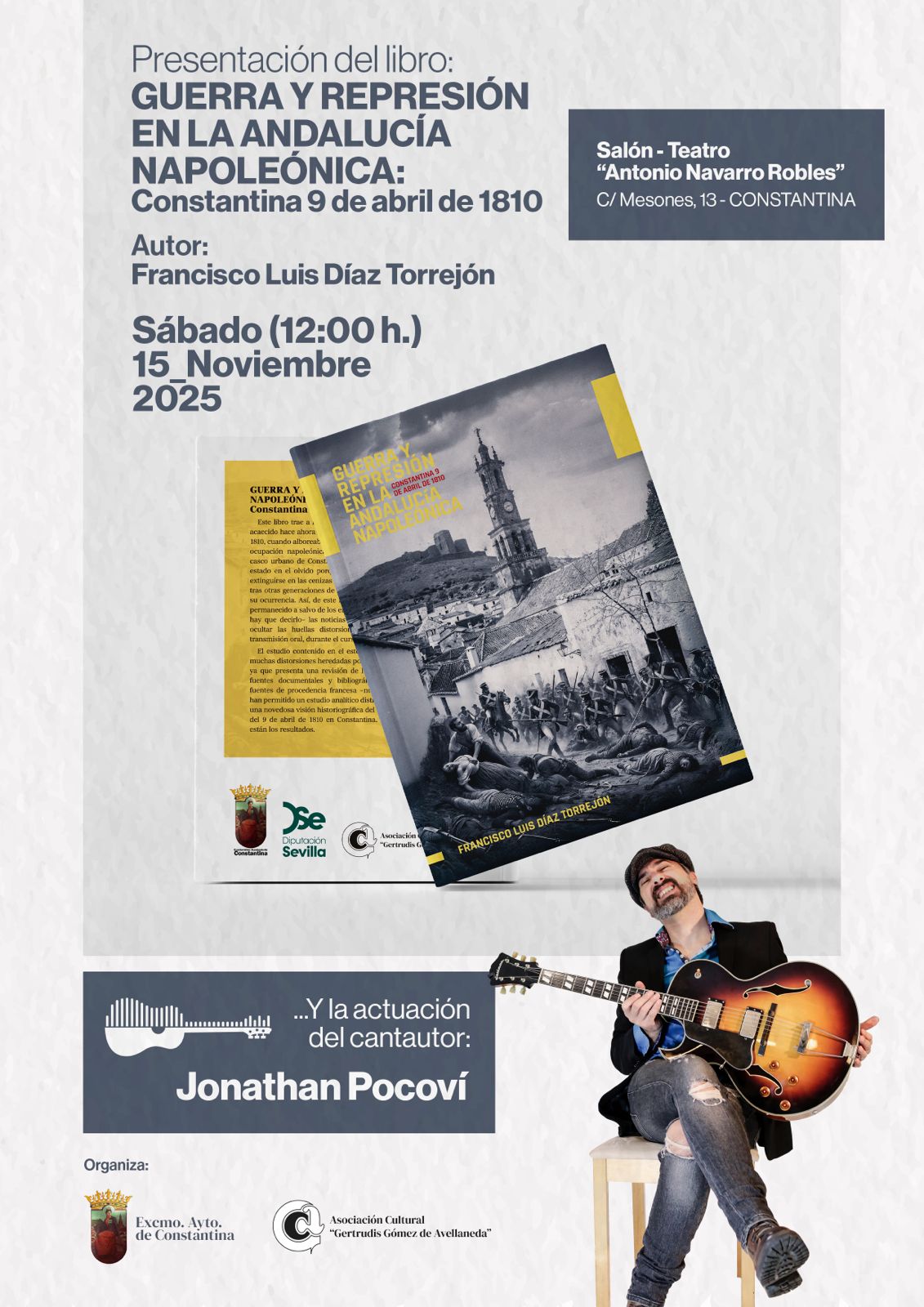 El próximo sábado 15 de noviembre, a las 12:00 horas, en el Salón-Teatro "Antonio Navarro Robles" de calle Mesones tendrá lugar la presentación del libro "Guerra y represión en la Andalucía napoleónica -Constantina 9 de abril de 1810-" de Francisco Luis Diaz Torrejón , editado por la Asociación Gertrudis Gómez de Avellaneda en colaboración con el Ayuntamiento de la localidad y Diputación de Sevilla.