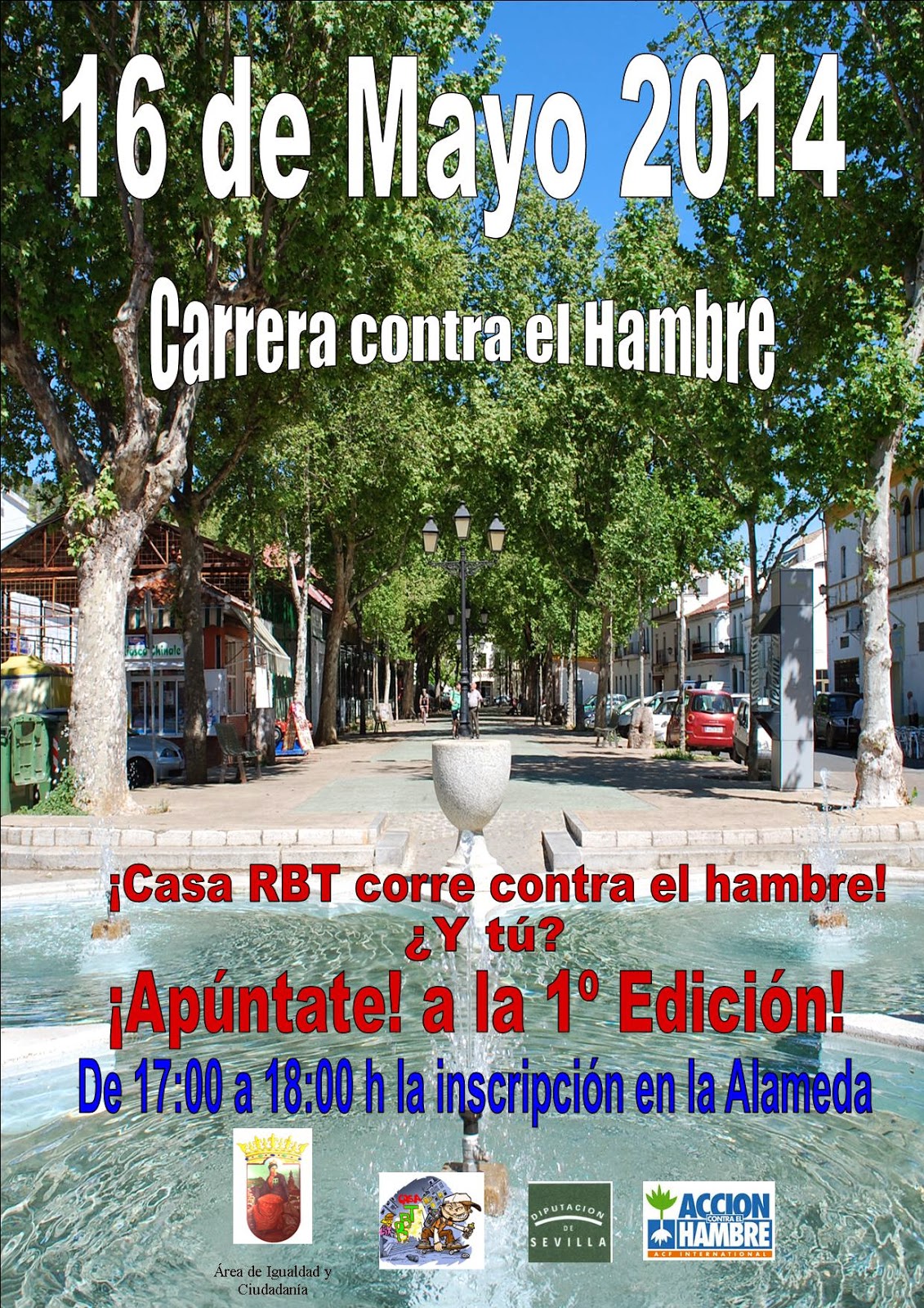 Casa RBT os invita a participar en la Primera Carrera Solidaria "Contra el Hambre", que será en el Paseo de la Alameda el viernes 16 de mayo por la tarde. A las 17:00 horas se abrirán las inscripciones para que donemos nuestro dinero por un dorsal para la carrera. Puedes hacerte con tu dorsal a partir de 1 ?. A las 18:00 horas se comenzarán las carreras