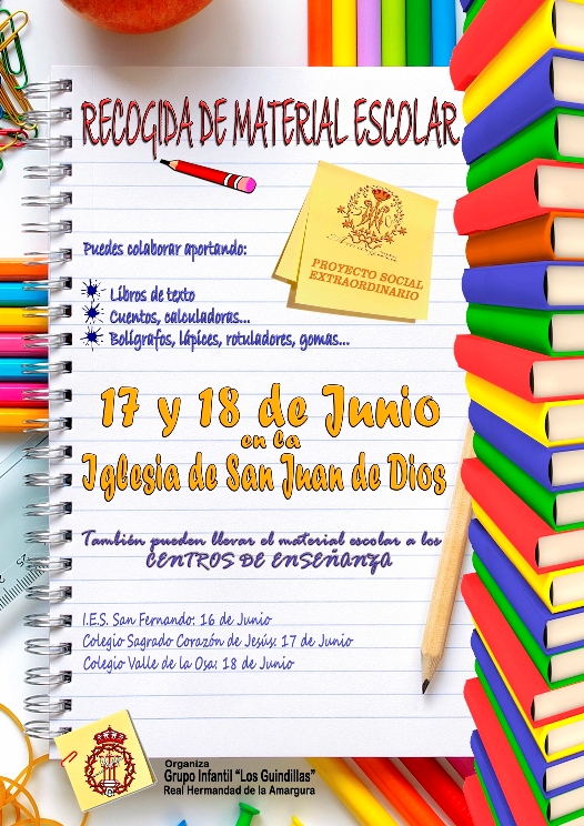 El Grupo Infantil "Los Guindillas" de la Hermandad de la Amargura se encuentra realizando un proyecto social extraordinario dentro de los actos conmemorativos del Cincuentenario de la Virgen de la Amargura.Se trata de una campaña de recogida de material escolar (libros de texto, cuentos, bolígrafos, rotuladores, lápices, gomas, cuadernos, etc.) para donársela a niños necesitados.