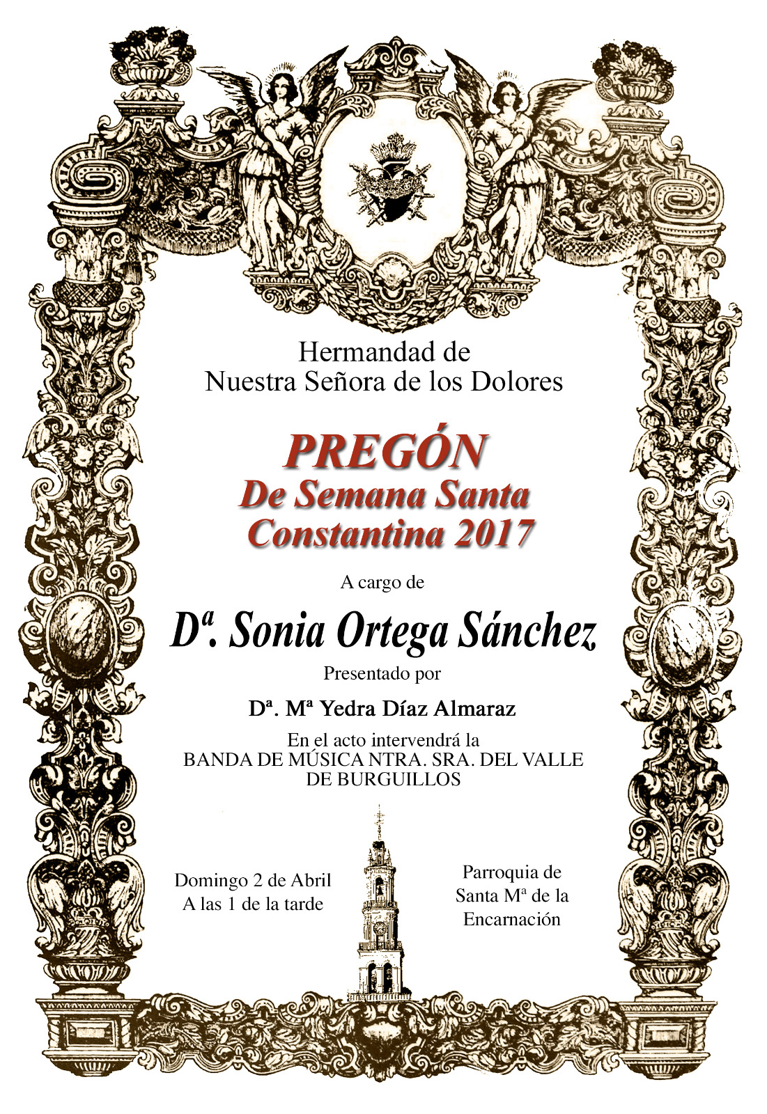 El próximo domingo, 2 de abril, tendrá lugar a las 13:00 horas en la Parroquia Santa Mª de la Encarnación, el Pregón de Semana Santa de Constantina 2017. Organizado por la Hermandad de Nuestra Señora de los Dolores, la pregonera de esta Semana Santa será Sonia Ortega Sánchez. La encargada de presentar el pregón será Mª Yedra Díaz Almaraz.