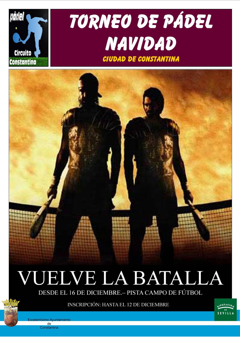 La Delegación de Deportes del Excelentísimo Ayuntamiento de Constantina organiza el Torneo de Pádel de Navidad "Ciudad de Constantina" 2013 que comenzará a disputarse a partir del próximo lunes 16 de diciembre en la pista del Campo Municipal de Deportes "Los Pinos".