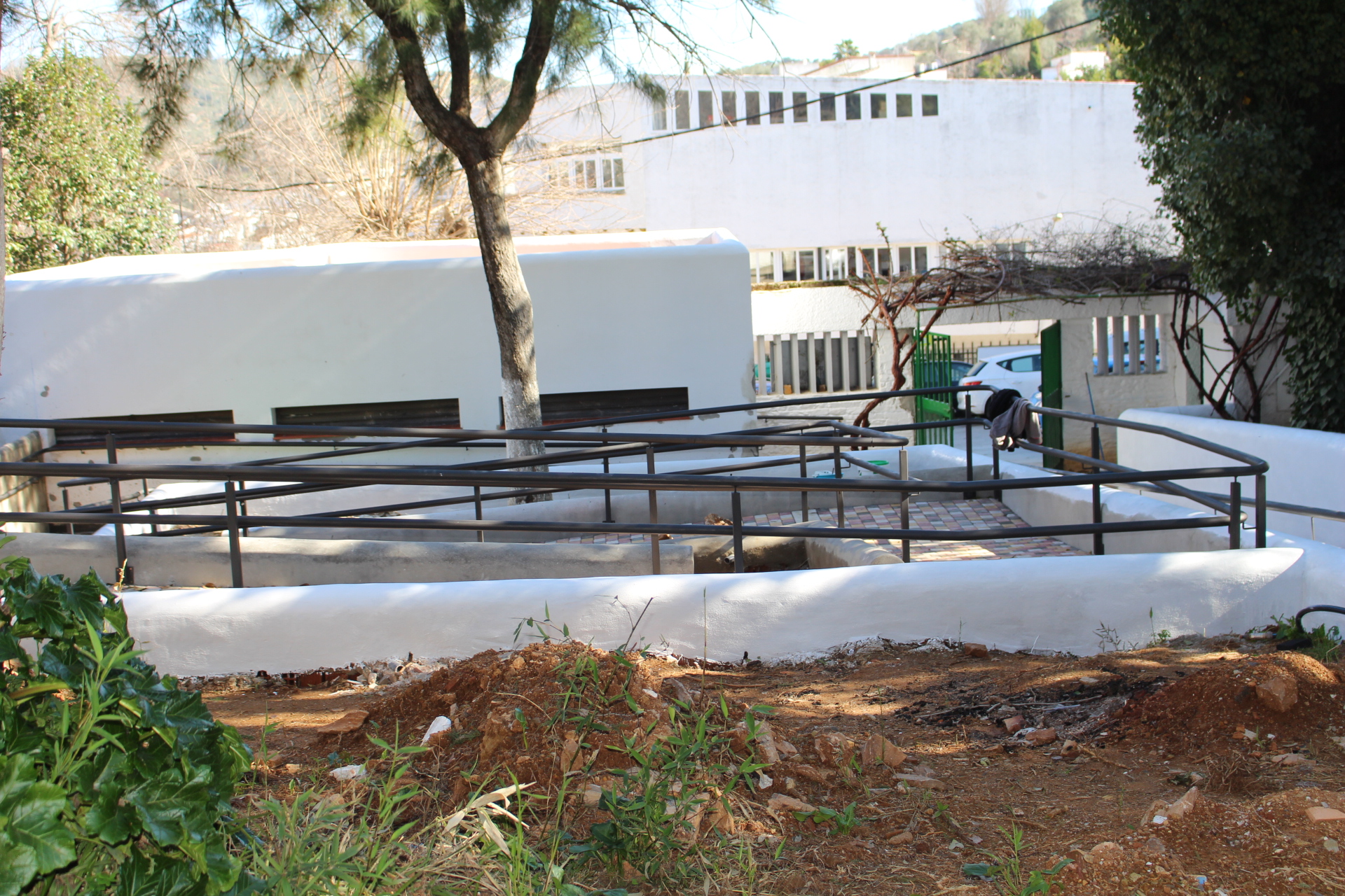 Forma parte de un proyecto mayor de Rehabilitación de la Terraza y Bar que ha ido ejecutándose en plazos y ahora mismo en lo que se está actuando es en la zona de accesos mejorando la accesibilidad que se hacía a través de dos rampas paralelas con distintas pendientes. Ahora se ha planteado una rampa de acceso general con pendiente adecuada y una rampa accesible anexa para personas con movilidad reducida. Todo con dotación de barandas y pasamanos adecuados a la normativa e incorporación de jardineras para vegetación entre las rampas. También se ha sustituido la luminaria de toda la entrada.
