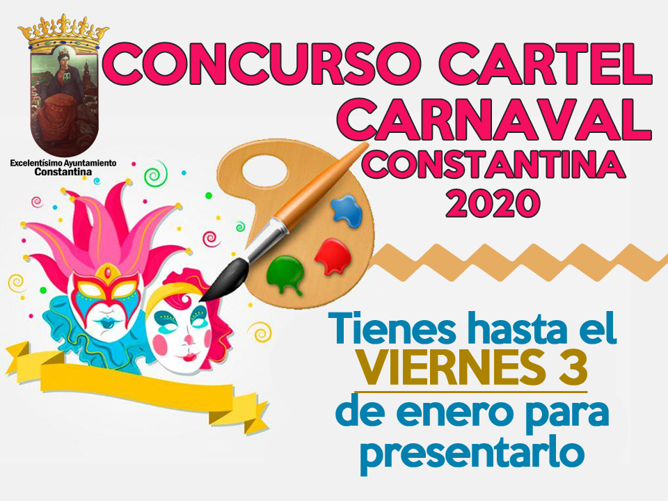 Se abre el plazo de presentación de trabajos para participar en el Concurso del Cartel de ?Carnaval 2020? de Constantina, que finalizará el viernes 3 de enero de 2020. Los originales deberán ser entregados en el Excelentísimo Ayuntamiento de Constantina (Área de Festejos -primera planta-) hasta las 14:00 horas de dicho día.
