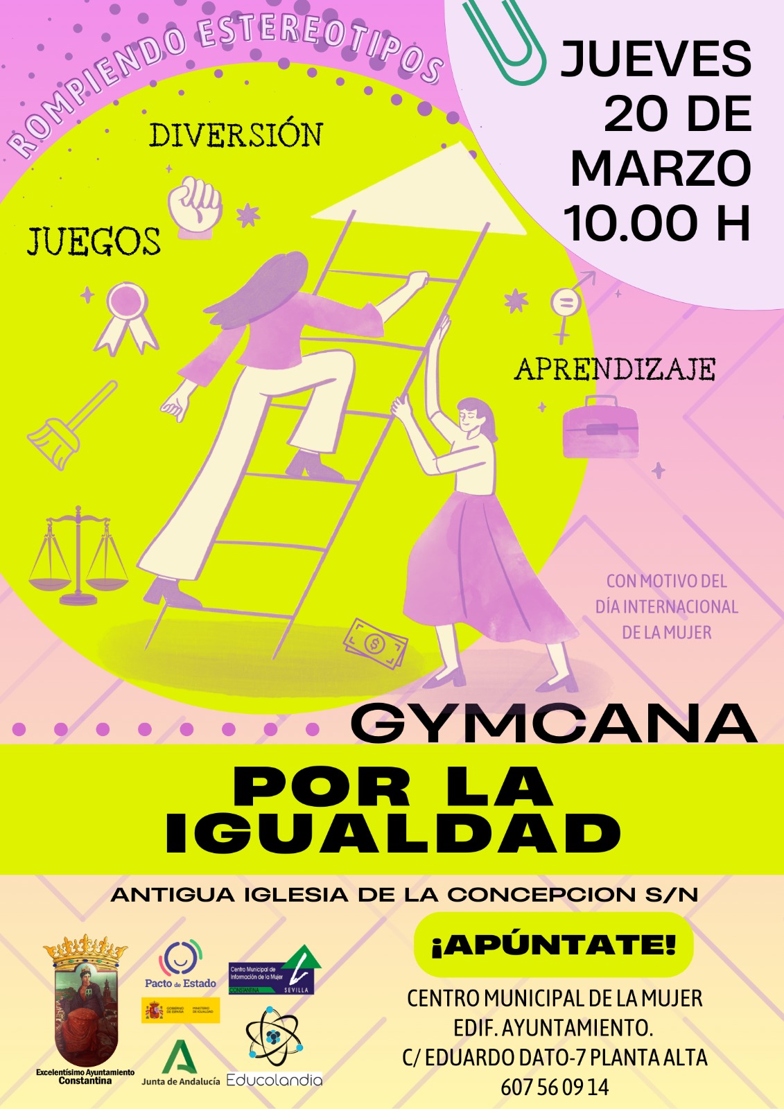 El Centro de la Mujer de Constantina te anima a inscribirte y participar, el próximo jueves 20 de marzo, a las 10:00 h, en la antigua Iglesia de la Concepción, en una actividad lúdica y educativa: la "YINCANA POR LA IGUALDAD".