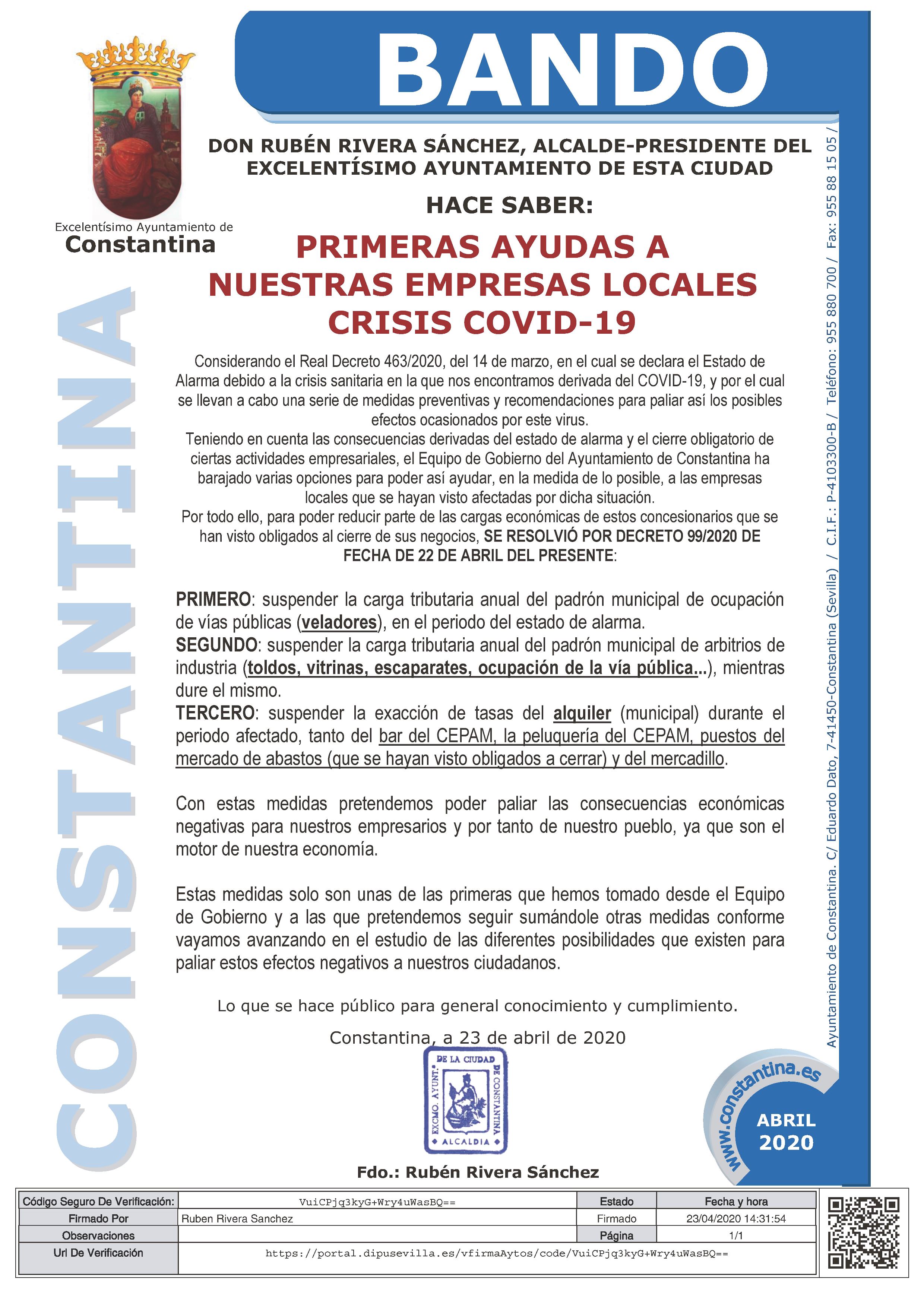 BANDO Constantina: Primeras ayuda a empresa locales crisis COVID-19