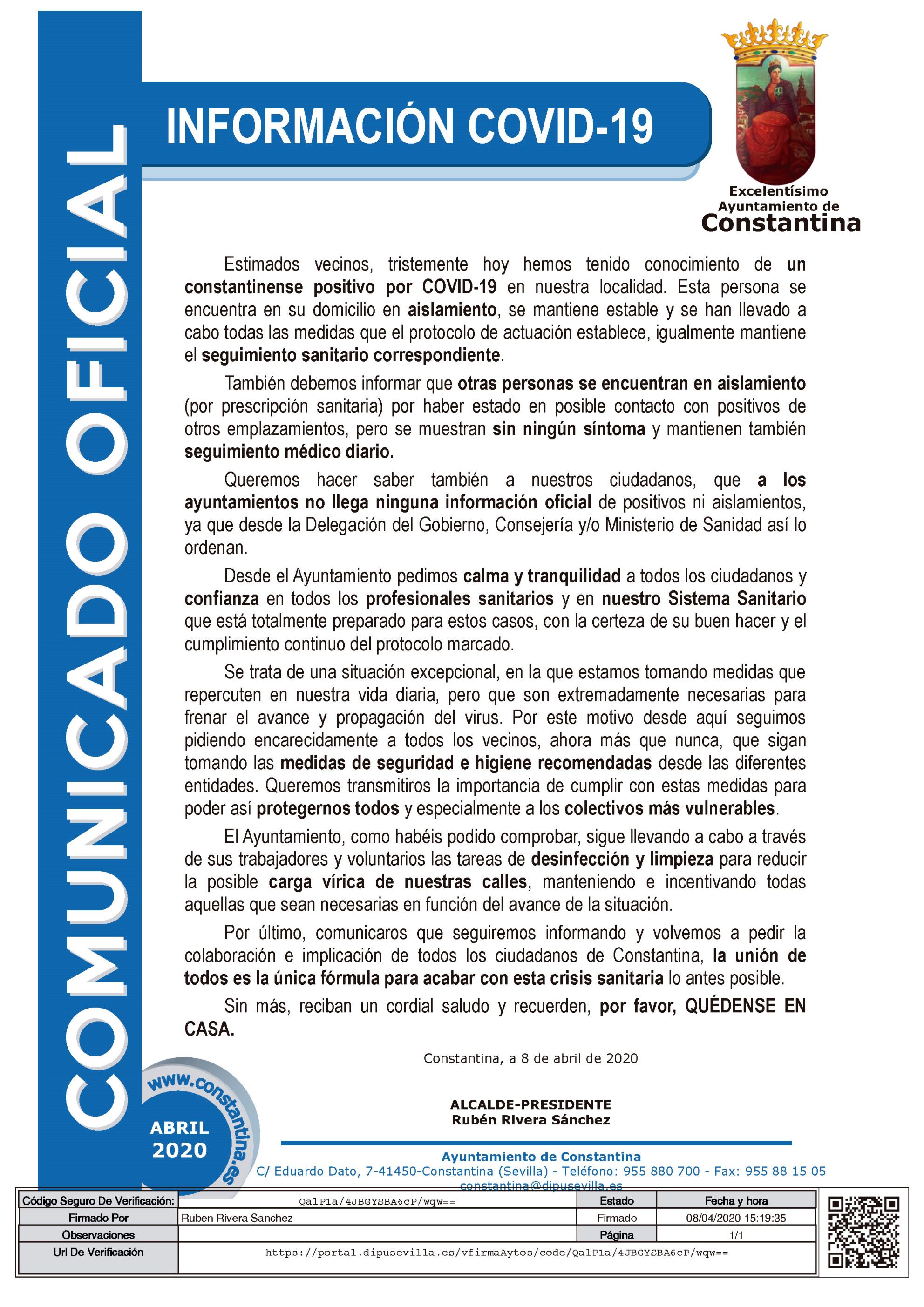Estimados vecinos, tristemente hoy hemos tenido conocimiento de un constantinense positivo por COVID-19 en nuestra localidad. Esta persona se encuentra en su domicilio en aislamiento, se mantiene estable y se han llevado a cabo todas las medidas que el protocolo de actuación establece, igualmente mantiene el seguimiento sanitario correspondiente.