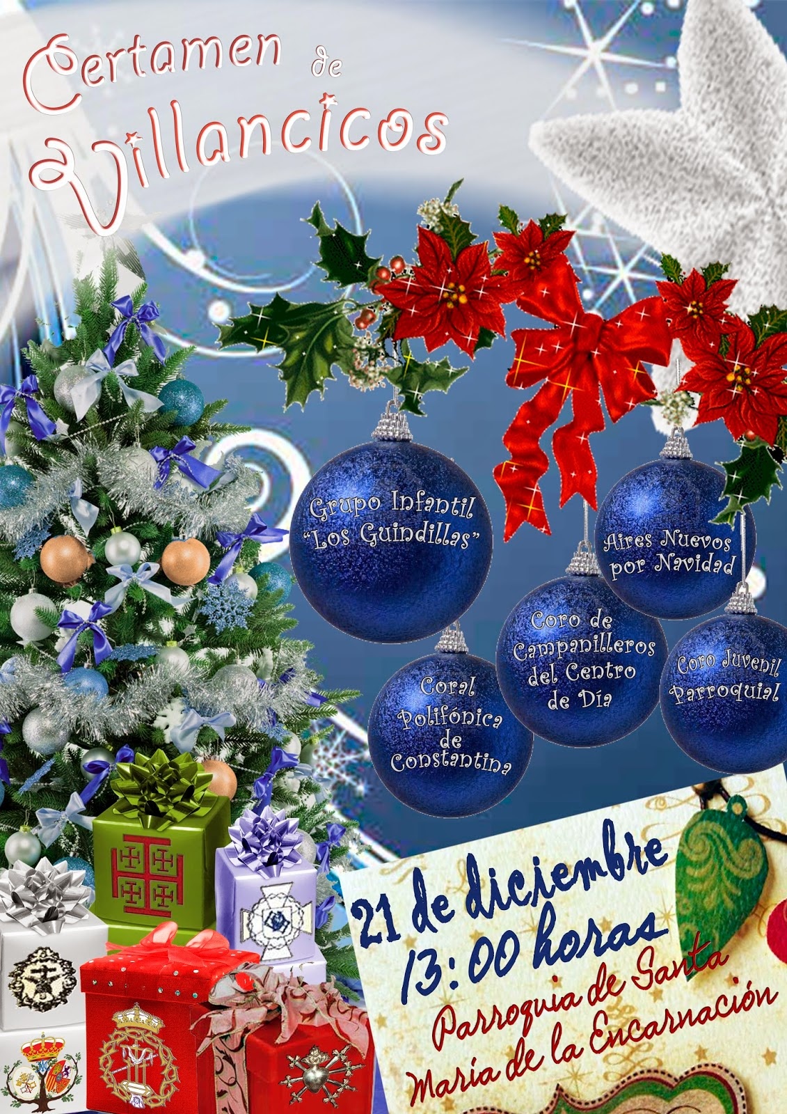 El próximo domingo, 21 de diciembre, las hermandades y asociaciones de Constantina nos ofrecen el Certamen de Villancicos 2014. El evento, con marcado carácter navideño, tendrá lugar en la Parroquia Santa Mª de la Encarnación a partir de las 13:00 horas.