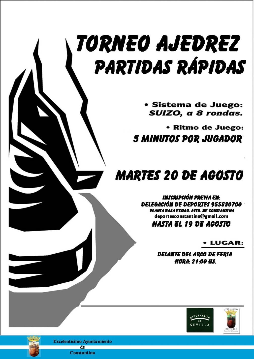 Organizado por la Delegación de Deportes del Excelentísimo Ayuntamiento de Constantina, en colaboración con la Diputación de Sevilla, hoy martes 20 de agosto se disputará, en el Paseo de la Alameda (delante del arco de feria), el Torneo de Partidas Rápidas de Ajedrez "Ciudad de Constantina", a las 21:00 horas.