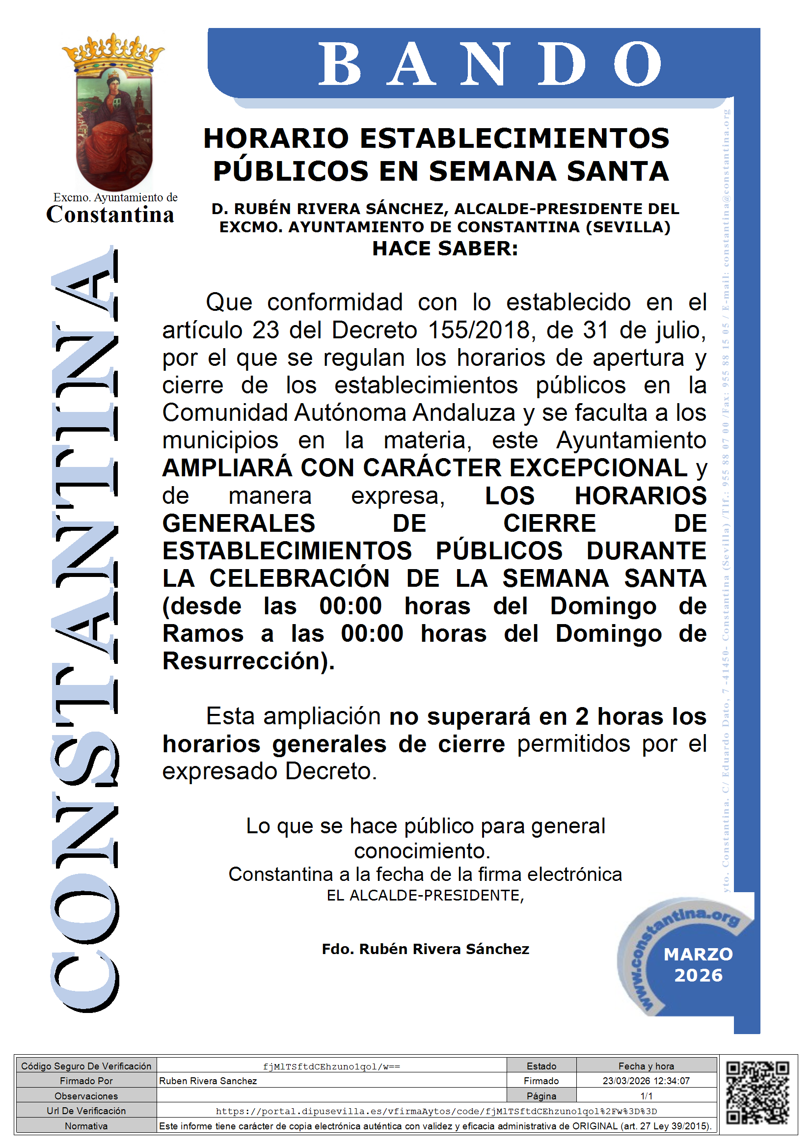 BANDO CONSTANTINA: AMPLIACIÓN CON CARÁCTER EXCEPCIONAL DE LOS HORARIOS GENERALES DE CIERRE DE ESTABLECIMIENTOS PÚBLICOS DURANTE LA CELEBRACIÓN DE SEMANA SANTA