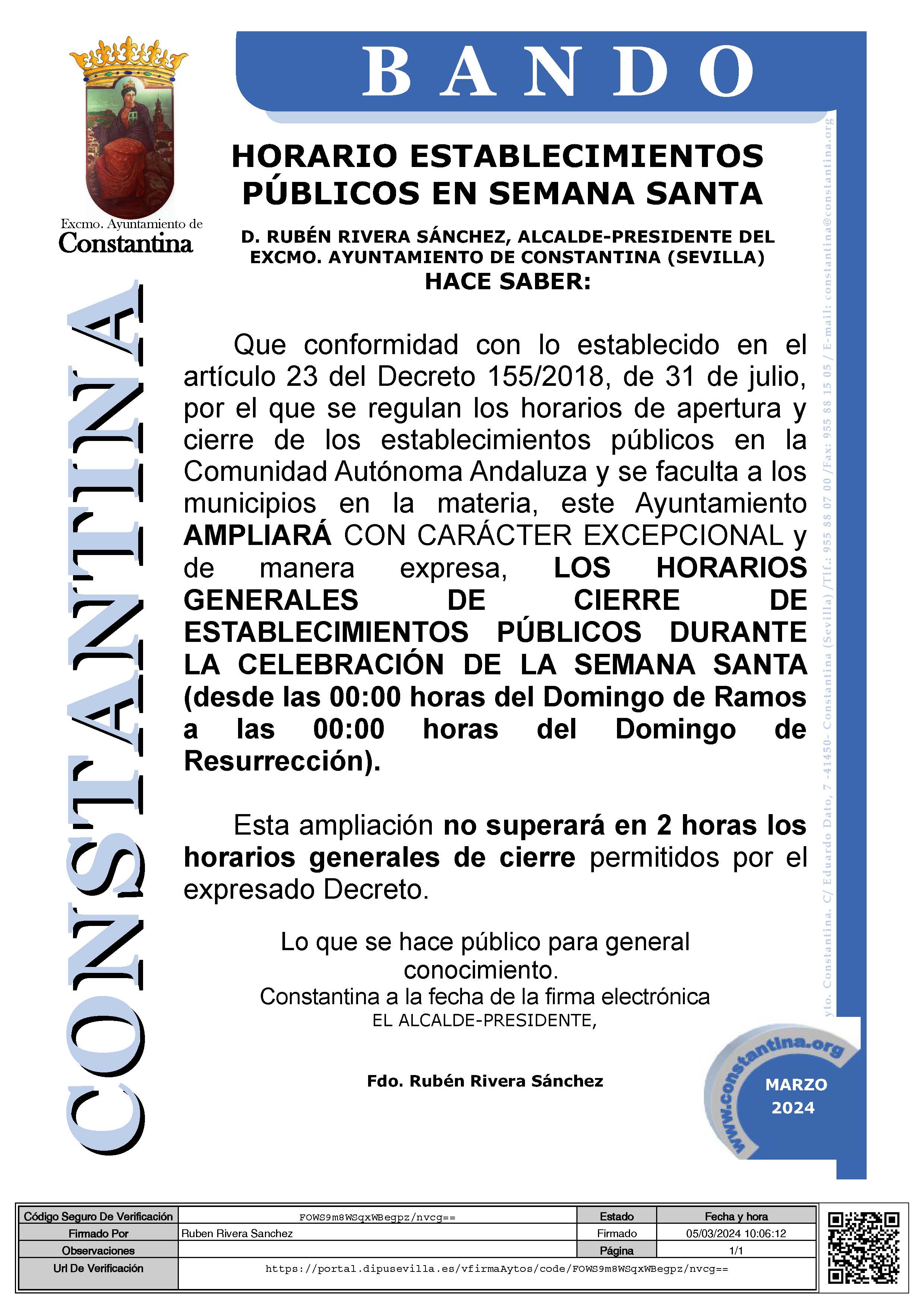 BANDO CONSTANTINA: Ampliación horario establecimientos públicos en Semana Santa